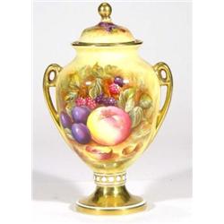 Twin handled Aynsley vase and cover, hand coloured and transfer printed with fruit, marks to base, 21cm high