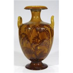 Twin handled Linthorpe pottery vase, decorated with leaves and a treacle glaze, impressed marks and initialled FB1361 to base, 30cm high
