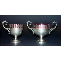 Twin handled silver plated sugar bowl and matching cream jug with cranberry glass liners, largest 13cm high