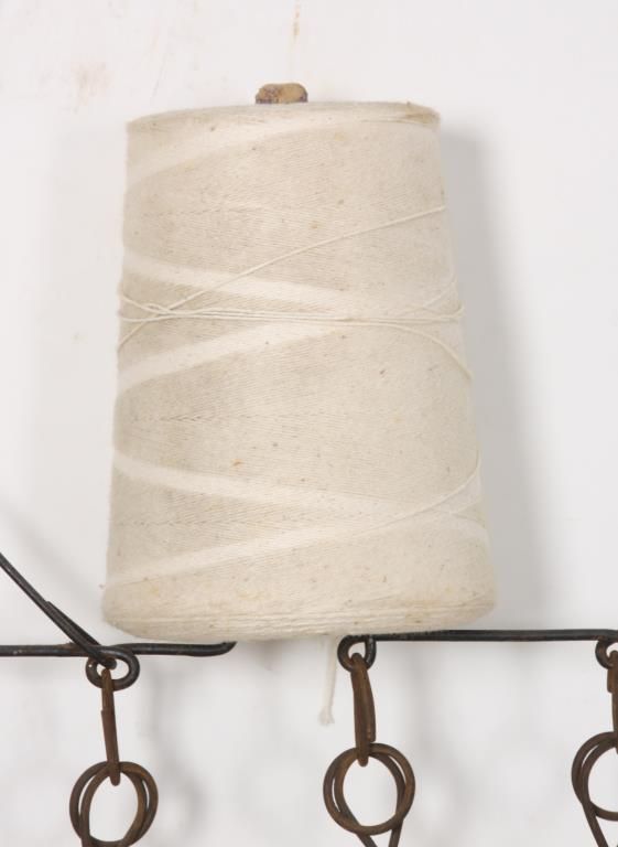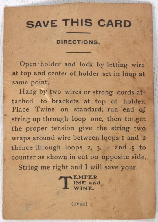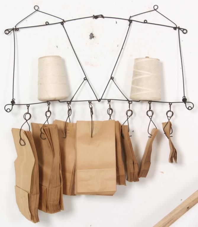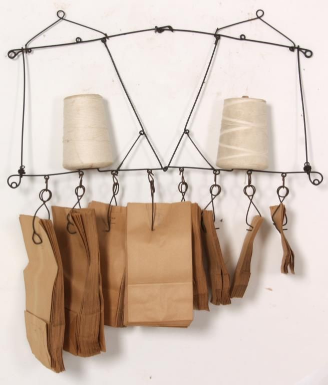 Country store Twine & Paper Bag Hanging Rack. By the E.O. Bulman Mfg. Co. of Grand Rapids Michigan, the hanging wire rack has 2 mounts for spools of twine over 8 hanging clamps to hold paper bags with original advertising card. Measures 20 in. high x 29.5 in. wide.