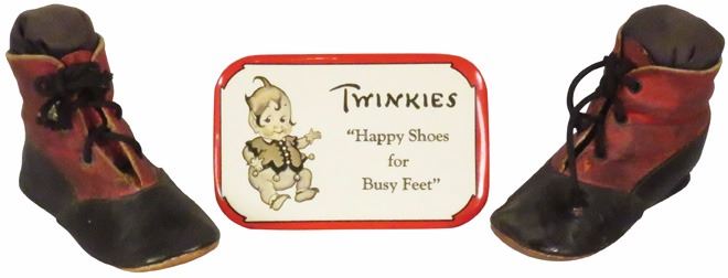 Twinkie Celluloid Counter Top Shoe Sign with Children's Shoes. Sign in mint condition, shoes show wear. 4 1/4 X 2 3/4 inches.