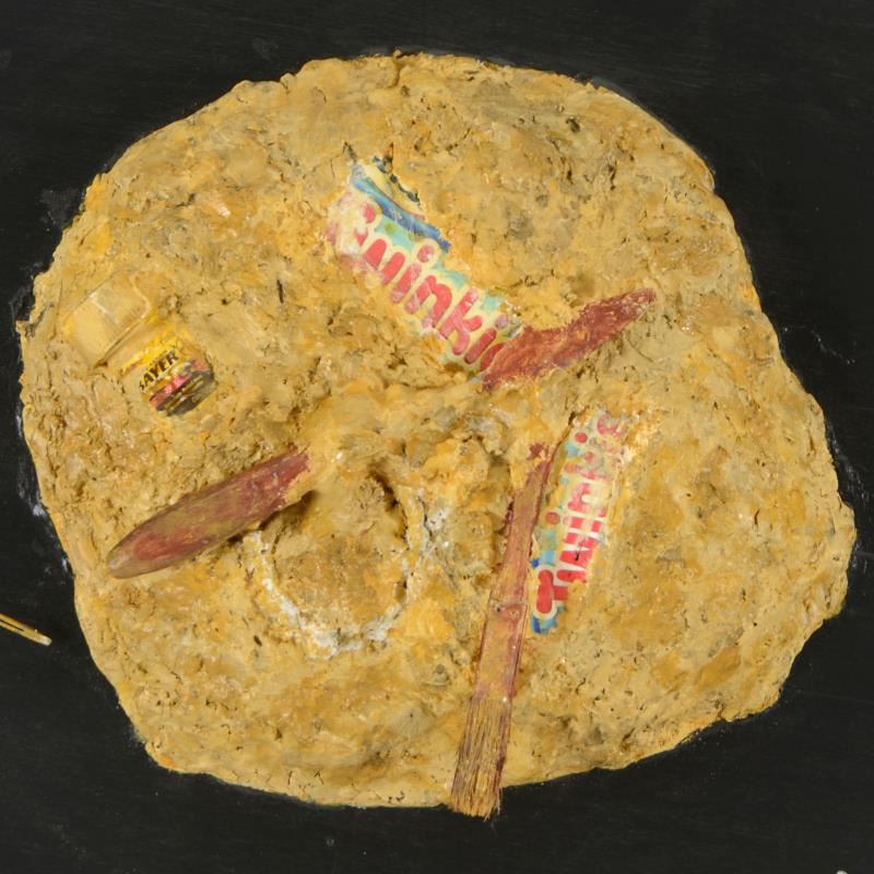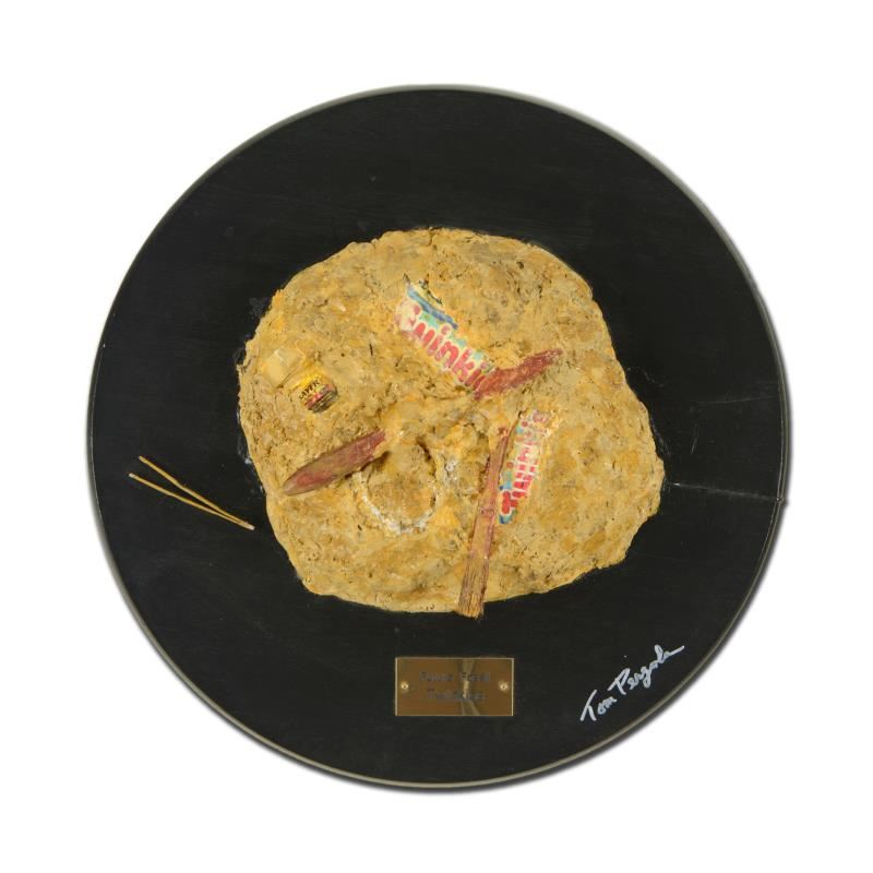 "Twinkies" is an original mixed media sculpture by Tom Pergola, hand signed by the artist. This piece cones mounted on wood. Includes Letter of Authenticity. Measures approx. 18" (diameter) x 4" (depth).