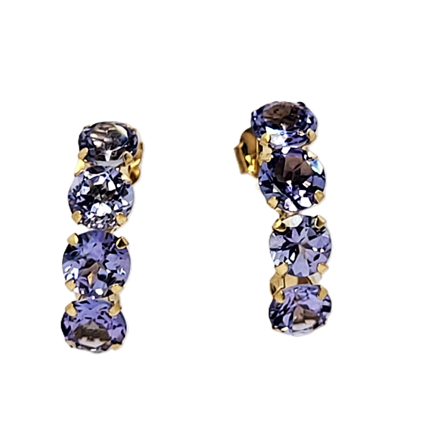 These 14 karat yellow gold earrings feature 2.00 carats total weight of round, faceted, prong-set, genuine tanzanite that are the perfect color for either winter or summer! They are approximately 5/8& quot; long and 3/16& quot; wide and attach to the earlobe with posts and friction backs. Admin:G11241/29brt
