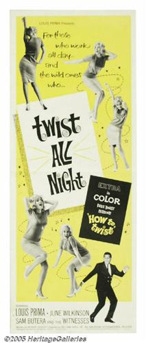 <B>"Twist All Night" Movie Insert Poster.</B></I> Sure, the plot was thin and they used only two sets, but the z-grade musical "Twist All Night" (1962) was good, cheesy fun that starred (and was produced by) trumpeter/vocalist/bandleader/personality Louis Prima -- backed by the equally great Sam Butera and the Witnesses -- as a musician trying to keep his club open. The 14" x 36" poster features some wear, folding creases, and mild discoloration, but is in otherwise Fine condition.