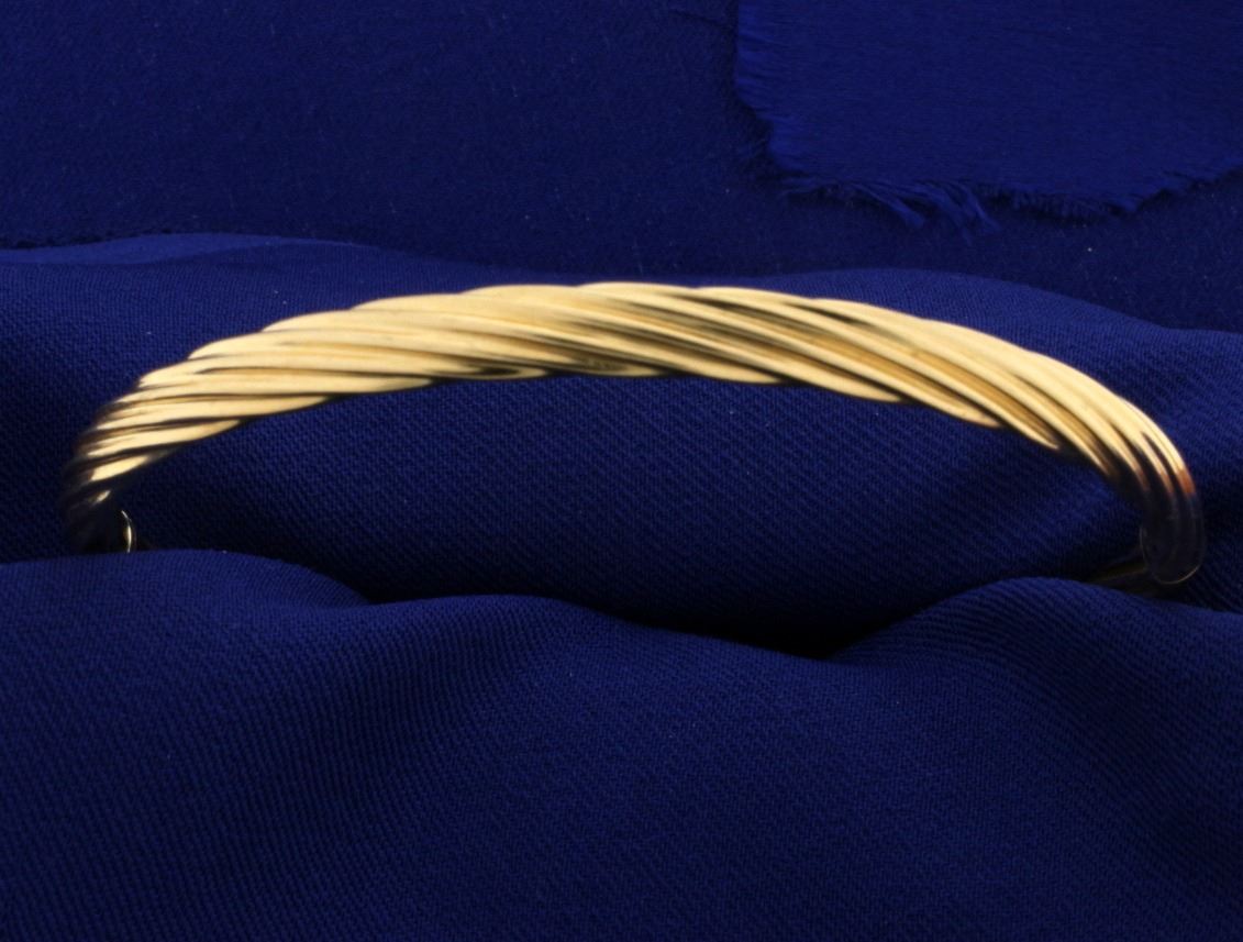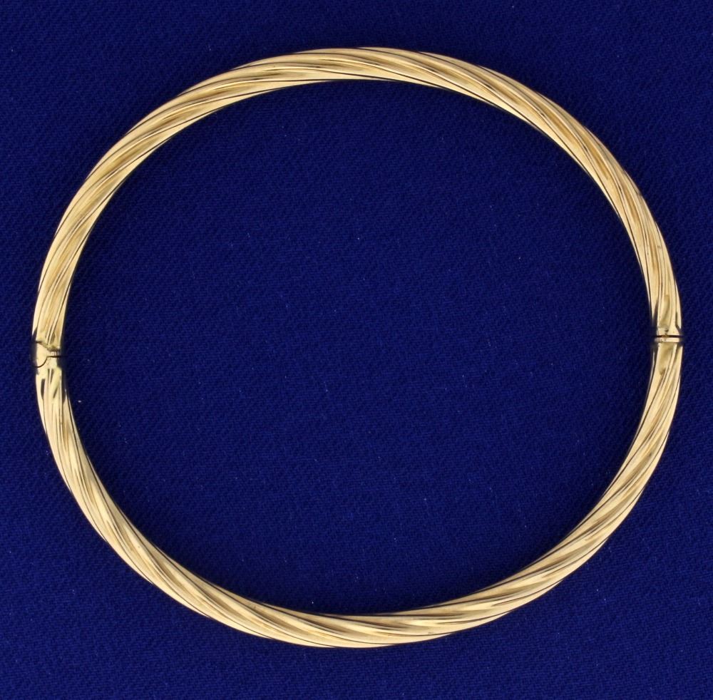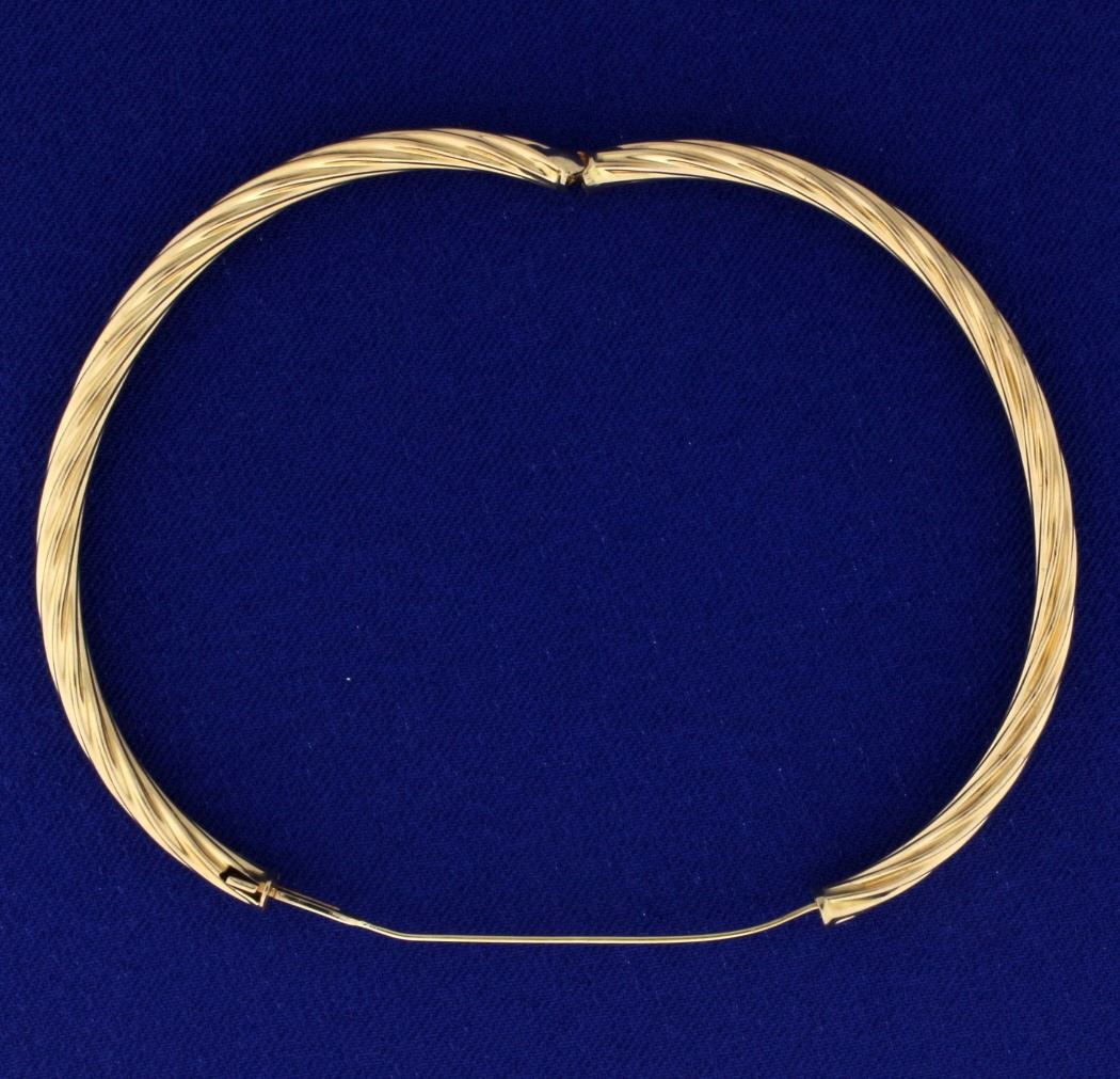In 14k yellow gold. 2 inch diameter with a hinge joint, making it easier to put on. 7.5g.