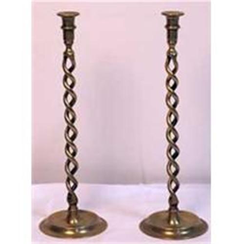 A pair of antique brass candlesticks with a spiral twist design. Standing 20" tall, with a 6.5" round base. The top of the candlesticks is 2" in diameter with a 1" opening. The are in very good condition with normal wear and minor scratches and nicks. The patina is original.