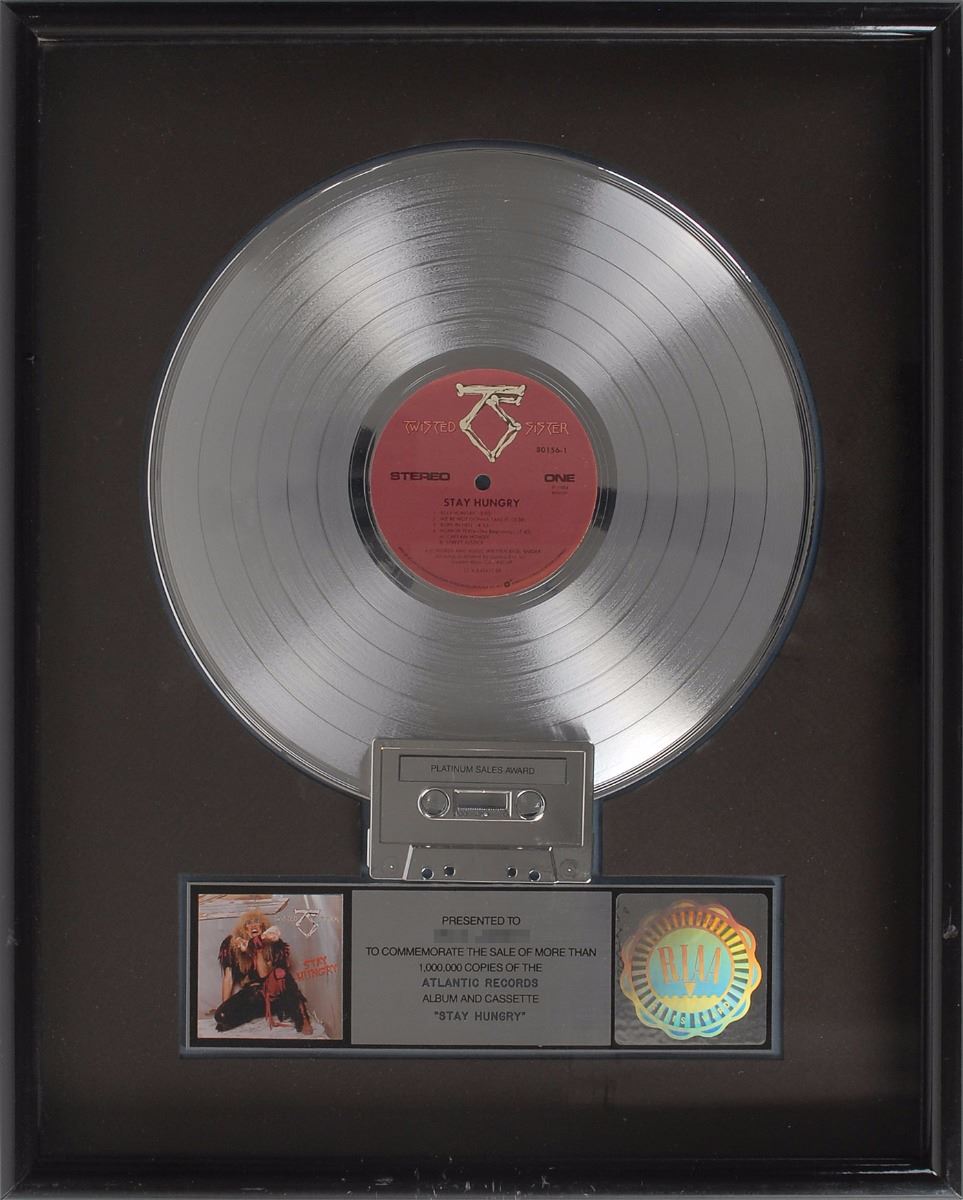 Official flower hologram-style RIAA platinum sales award presented “to commemorate the sale of more than 1,000,000 copies of the Atlantic Records album and cassette ‘Stay Hungry.’” Framed with its disc, cassette, plate, and a small image of the album cover to an overall size of 17 x 21. Award retains its original backing with a Fitzgerald Hartley label. In fine condition.