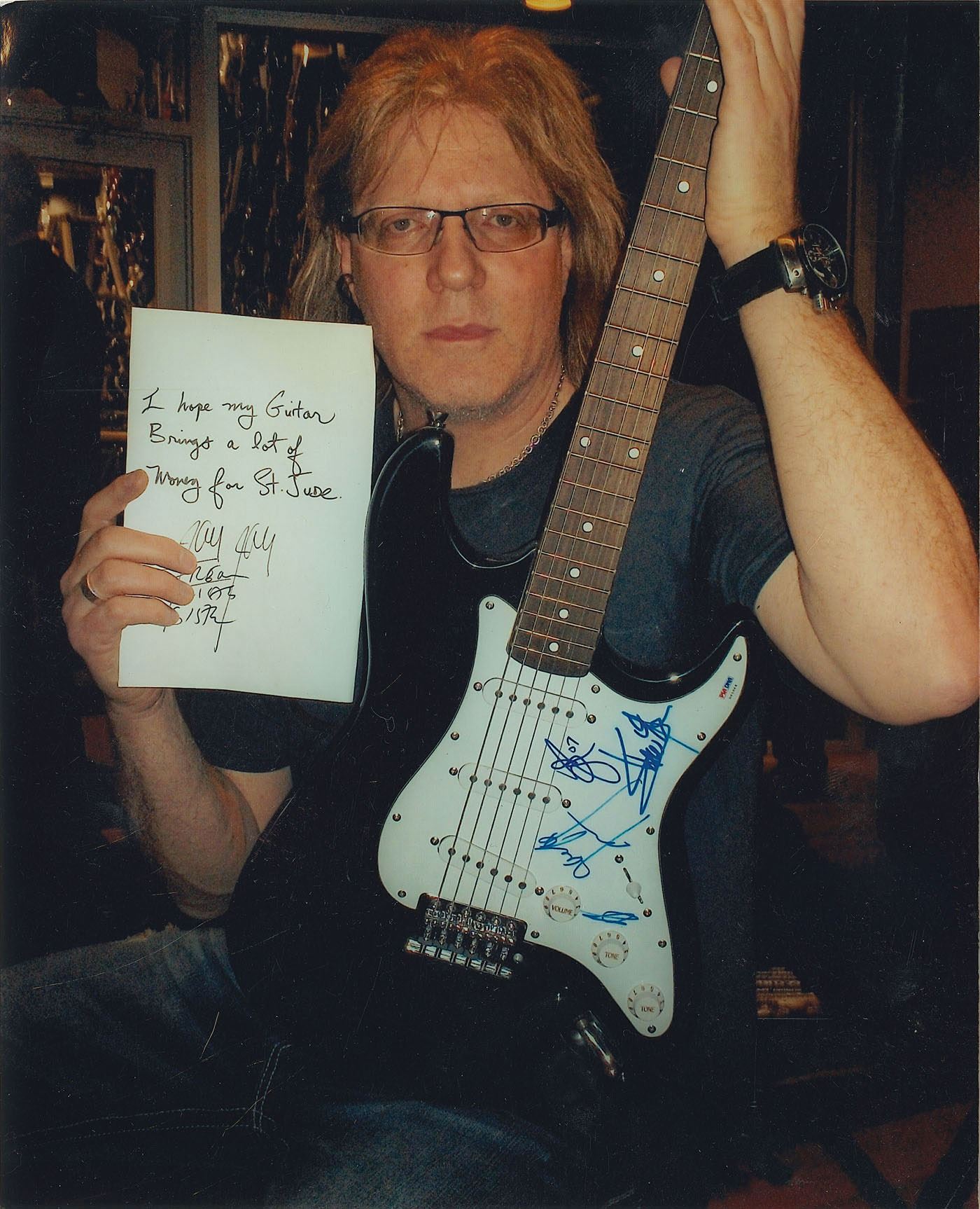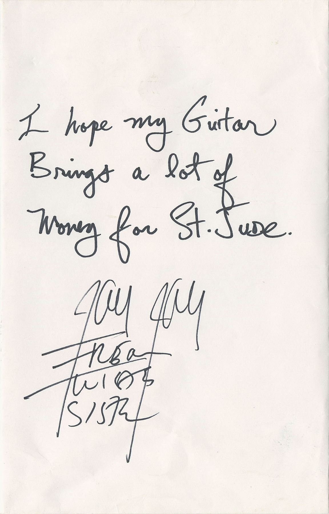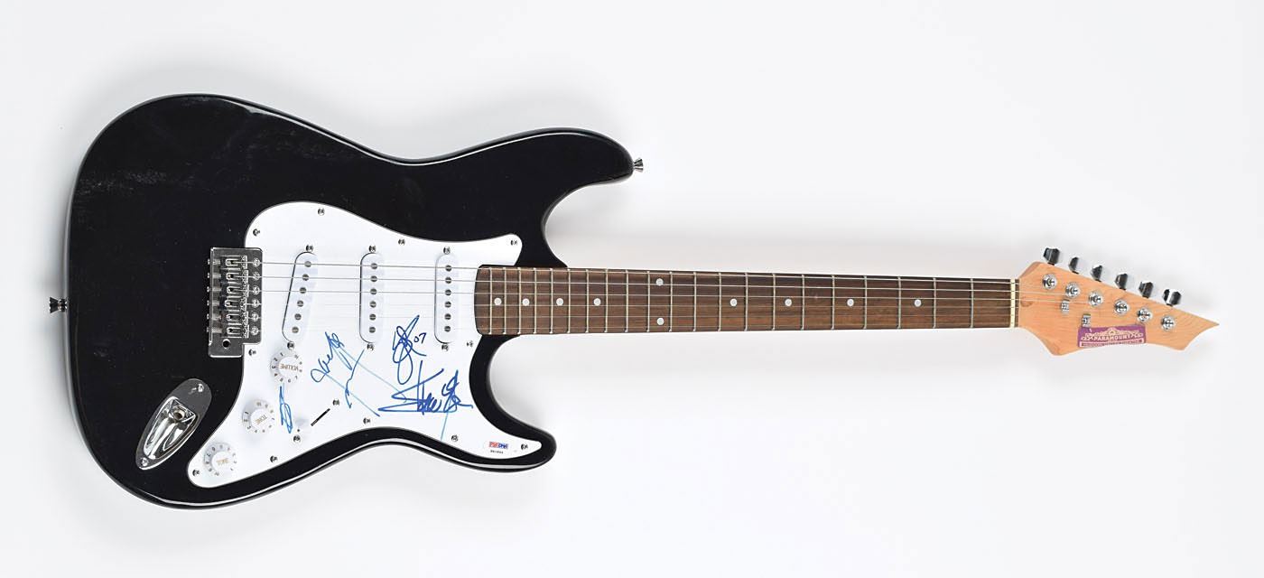 Black-bodied Stratocaster style electric guitar, signed on the white pickguard by Dee Snider, Eddie Ojeda, Jay Jay French, and A. J. Pero. Also includes an ANS from French on a white 6.5 x 10 sheet, "I hope my Guitar Brings a lot of money for St. Jude, Jay Jay French, Twisted Sister," with accompanying photos of French holding up the note and the offered guitar, as well as two others of him at the charity auction. In fine condition, with a PSA/DNA label affixed to pickguard. Accompanied by a certificate of authenticity from PSA/DNA.