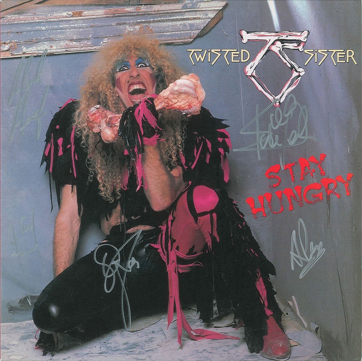 Stay Hungry album signed on the front cover in silver ink by Dee Snider, Eddie Ojeda, Jay Jay French, Mark Mendoza, and A. J. Pero. In fine condition. The record is included.