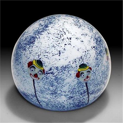 Twists Glass Studio 2006 "Clown Balloon" encased surface design miniature paperweight. Five spaced balloons surround the sides of the white-speckled blue weight, including a signature cane and four clown face portrait canes, each with a red nose, and a green and yellow hat. Signed/dated. Diameter 2 1/8".