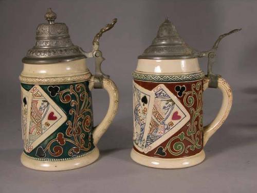 Two 1/2 liter German steins with playing card design, green background, Manufacturer 1255A - red background Manufacturer # 1255A, no chips or cracks.