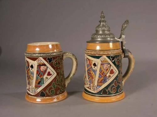 Two 1/2 liter German steins with playing card design, Manufacturer #1255A - 1920's, one's lid is missing, no chips or cracks on either.