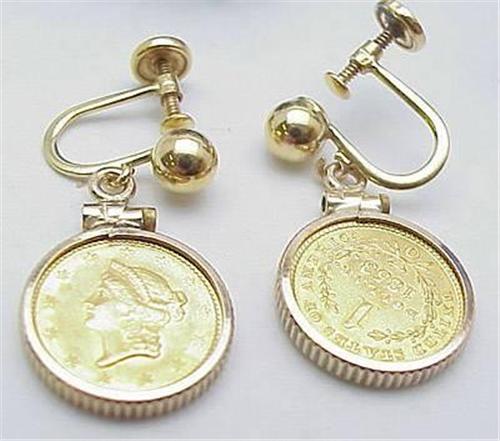 Two 1$ liberty head gold coins dated 1885 in 14k bezels with screw back posts. 6.0gr
