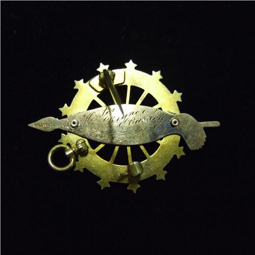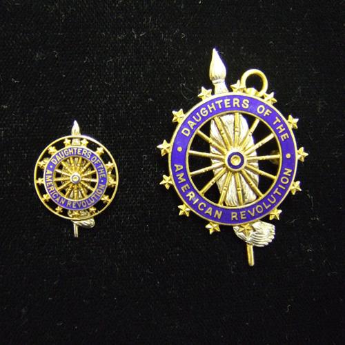 Two 14k gold D.A.R pins; one 1" in diameter (of circle); marked Caldwell & Co. 14k; engraved on back Hester Bryner Baskey number 200865; weight 3.6 dwt/5.6 grams; and one 5/8" in diameter marked J.E. Caldwell & Co.14k; weight 1.3 dwt/2.1 grams (no visible defects)