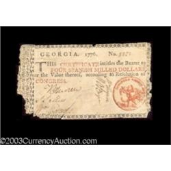 <TABLE cellSpacing=0 cellPadding=0 width="100%" bgColor=#000000 border=0><TBODY> <TR><TD width="100%"><TABLE cellSpacing=1 cellPadding=3 width="100%" border=0><TBODY><TR><TD width="100%" bgColor=#79735c><FONT face=arial color=#ffffff size=3><B>Description</B> </FONT></TD></TR><TR><TD width="100%" bgColor=#ffffff><FONT face=arial size=2><B>Two 1776 Colored Seal Georgias.</B></I> A $4 Liberty Cap Orange Seal and a $1 Justice Blue Seal, both notes with a number of problems and a number of merits. Both would net grade <B>Fine</B></I> for value. (500--up) (2 notes) </FONT></TD></TR></TBODY></TABLE></TD></TR></TBODY></TABLE><BR><TABLE cellSpacing=0 cellPadding=0 width="100%" bgColor=#000000 border=0><TBODY><TR> 2 notes Important notice: Heritage usually auctions material at the rate of 200-250 lots per hour. On some occasions eBay Live bid software or the Internet may not be able to keep up with the pace of the auction. We recommend placing a realistic absentee bid now as insurance to avoid disappointment. Occasionally the auctioneer may eliminate or reject an eBay Live bid, and the auctioneer may also reopen a lot after the close of the eBay live bidding (usually because we missed an audience bid), and may reject your bid even if it shows you as the winning bidder. By bidding via eBay Live, you agree that Heritage may award the lot to another bidder at its sole discretion under the circumstances described above or any other reasonable circumstances. Also please note that all Heritage lots purchased through eBay Live carry a 20% Buyer's Premium. Please make sure you read the Terms and Conditions before you bid.</TR></TBODY></TABLE>