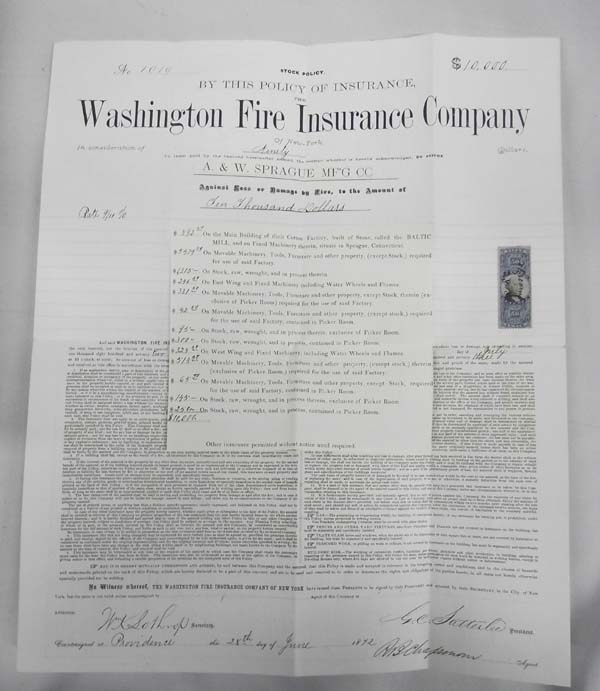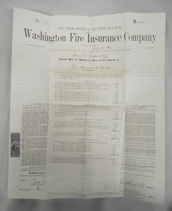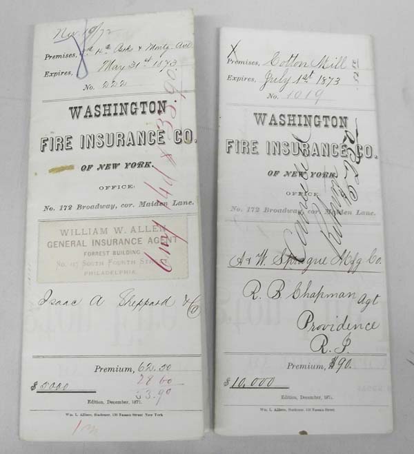 Two 1873 Washington Fire Insurance Policies. Revenue stamps included. Measures approx. 17''L x 13 1/2''W. Buyers Pay Actual Shipping and Handling Charges(see terms and conditions for more information).