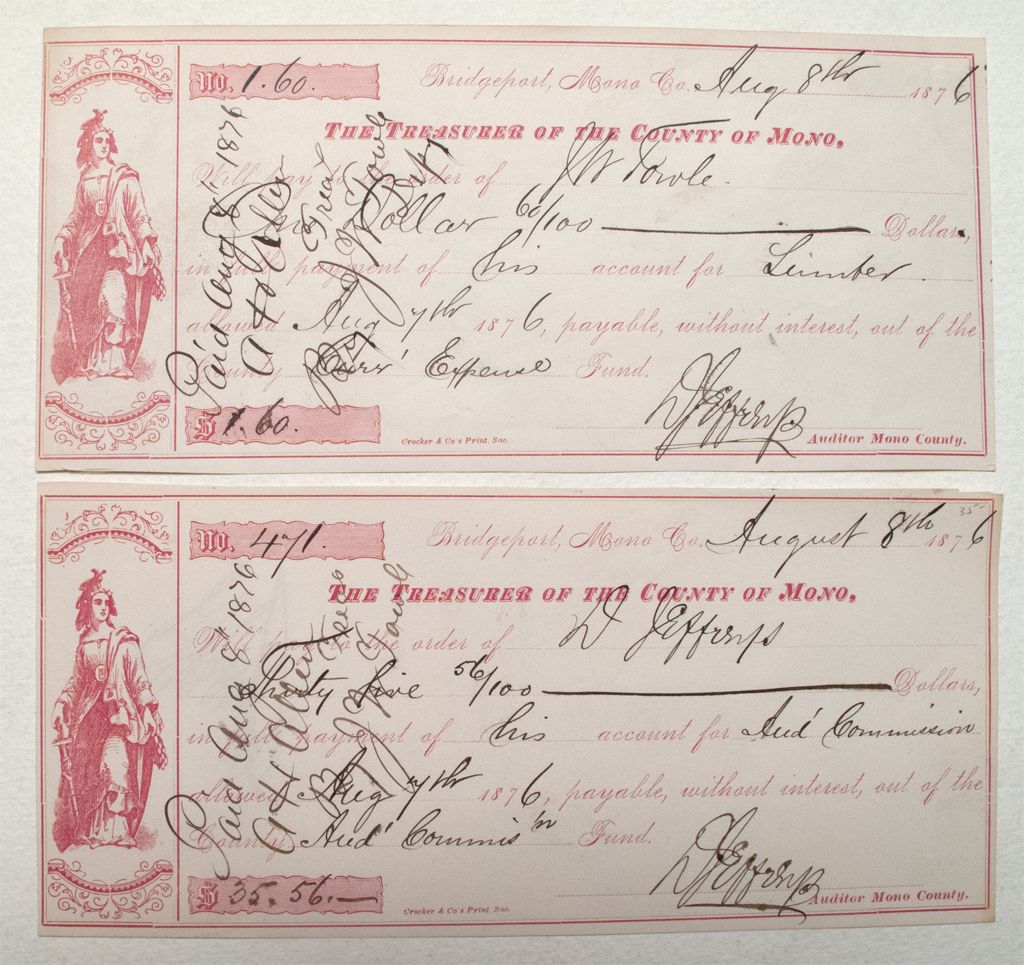 Two warrants. One for $1.60 for lumber and one for $35.56 for commission. Signed by D Jeffrey's, auditor of Mono County. (Ames Collection)