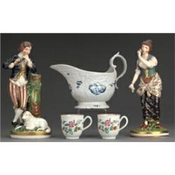 Two 18th Century English porcelain coffee cups having moulded scroll handles, exteriors with poly...