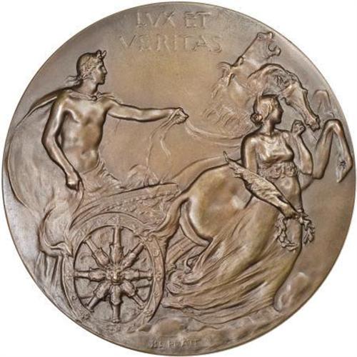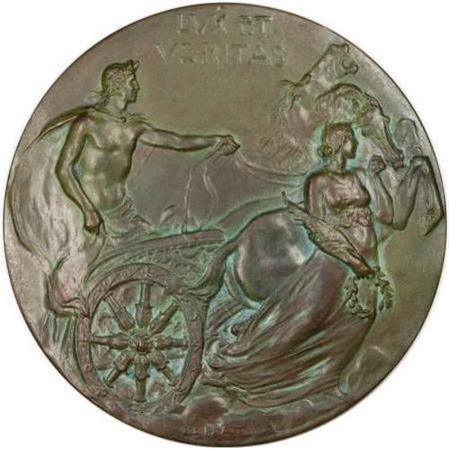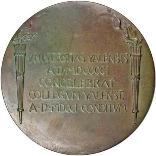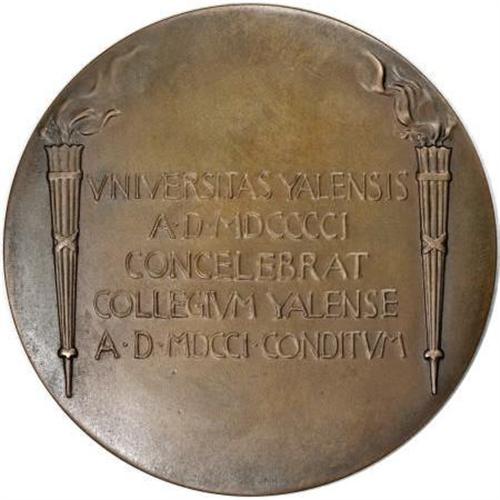 <B>Two 1901 Yale University Bicentennial Medals.</B></I> Bronze, 59.5 mm. Obverse has motto LUX ET VERITAS, above design of Roman male commanding a two-horse chariot. A woman bearing a wreath and quill pen is front of the chariot. Bela Lyon Pratt, of Indian quarter and half eagle fame, is the engraver. One of the medals has light green verdigris in protected areas. One original box accompanies the lot, and has a working clasp. The box grades VG.<BR><BR><b>Shipping:</b> Coins & Currency (<a target="_blank" href="http://www.heritageauctions.com/common/shipping.php">view shipping information</a>)