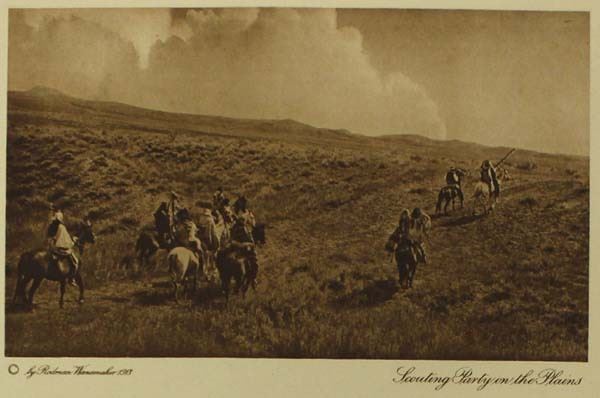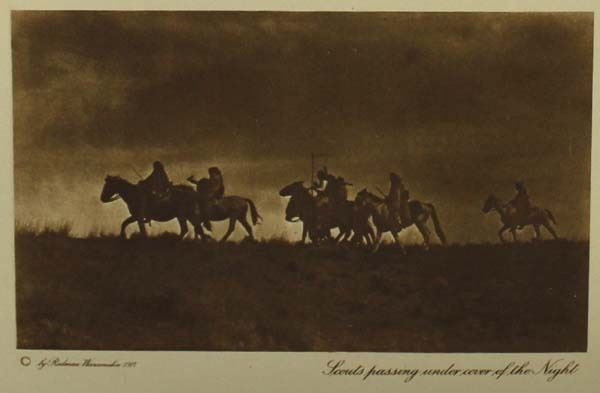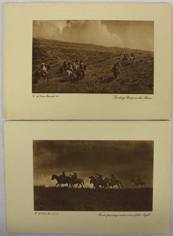 Two 1913 Prints by Rodman Wanamaker, measure 9.5'' x 7'', includes ''Scouts passing under cover of the Night'' and Scouting Party on the Plains,'' FYI: ''Between 1908 and 1913, Wanamaker sponsored three photographic expeditions to the American Indians intended to document a vanishing way of life and make the Indian ''first-class citizens'' to save them from extinction. At that time, Indians were viewed as a ''vanishing race'', and efforts were made to bring them increasingly into the mainstream of American life, often at the expense of their culture and traditions. Joseph K. Dixon was the photographer. On the first expedition, he made many portraits and captured scenes of Indian life. Dixon published them in a book, The Vanishing Race. (Original copies of the book are becoming scarce as people break it up to sell the photographs individually.) The expedition climaxed on the Crow Indian Reservation with the filming of a motion picture about Hiawatha. The second expedition in 1909 involved a motion filming a reenactment of the Battle of the Little Big Horn. The third expedition, the ''Expedition of Citizenship,'' took place in 1913. For it, the American flag was carried to many tribes, and their members were invited to sign a declaration of allegiance to the United States.''