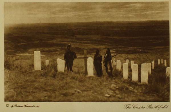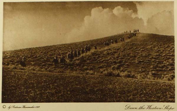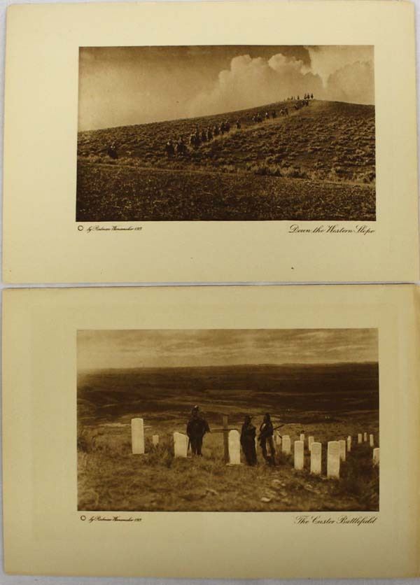 Two 1913 Prints by Rodman Wanamaker, measure 9.5'' x 7'', includes ''Down the Western Slope'' and ''The Custer Battlefield'', FYI: ''Between 1908 and 1913, Wanamaker sponsored three photographic expeditions to the American Indians intended to document a vanishing way of life and make the Indian ''first-class citizens'' to save them from extinction. At that time, Indians were viewed as a ''vanishing race'', and efforts were made to bring them increasingly into the mainstream of American life, often at the expense of their culture and traditions. Joseph K. Dixon was the photographer. On the first expedition, he made many portraits and captured scenes of Indian life. Dixon published them in a book, The Vanishing Race. (Original copies of the book are becoming scarce as people break it up to sell the photographs individually.) The expedition climaxed on the Crow Indian Reservation with the filming of a motion picture about Hiawatha. The second expedition in 1909 involved a motion filming a reenactment of the Battle of the Little Big Horn. The third expedition, the ''Expedition of Citizenship,'' took place in 1913. For it, the American flag was carried to many tribes, and their members were invited to sign a declaration of allegiance to the United States.''