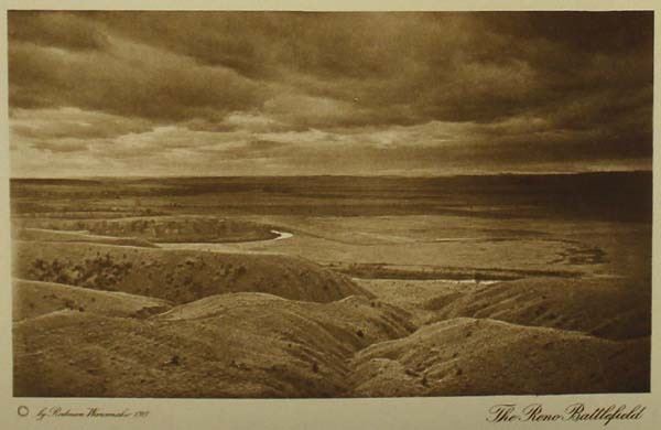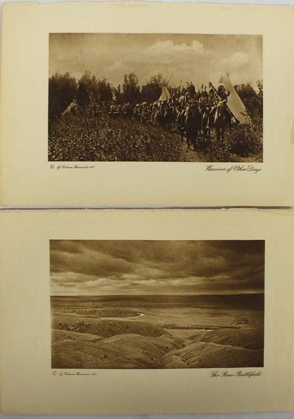 Two 1913 Prints by Rodman Wanamaker, measure 9.5'' x 7'', includes ''Warriors of Other Days'' and ''The Reno Battlefield'', FYI: ''Between 1908 and 1913, Wanamaker sponsored three photographic expeditions to the American Indians intended to document a vanishing way of life and make the Indian ''first-class citizens'' to save them from extinction. At that time, Indians were viewed as a ''vanishing race'', and efforts were made to bring them increasingly into the mainstream of American life, often at the expense of their culture and traditions. Joseph K. Dixon was the photographer. On the first expedition, he made many portraits and captured scenes of Indian life. Dixon published them in a book, The Vanishing Race. (Original copies of the book are becoming scarce as people break it up to sell the photographs individually.) The expedition climaxed on the Crow Indian Reservation with the filming of a motion picture about Hiawatha. The second expedition in 1909 involved a motion filming a reenactment of the Battle of the Little Big Horn. The third expedition, the ''Expedition of Citizenship,'' took place in 1913. For it, the American flag was carried to many tribes, and their members were invited to sign a declaration of allegiance to the United States.''