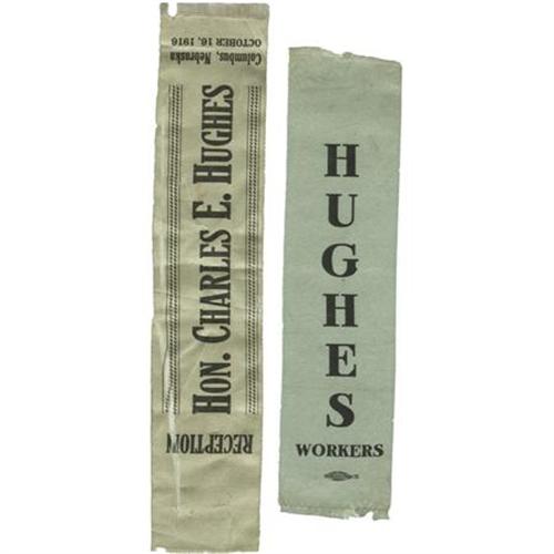 <B>Two 1916 Republican Presidential Silk Campaign Ribbons, Charles Evans Hughes</B></I> - the first, 1 7/8" x 7 ", "Hughes Workers"; the second, 1 " x 8 ", "Reception Hon. Charles E. Hughes Columbus, Nebraska October 16, 1916", the last ribbon fragile. <BR><BR><b>Shipping:</b> Miscellaneous Collectibles, Smal (<a target="_blank" href="http://www.heritageauctions.com/common/shipping.php">view shipping information</a>)