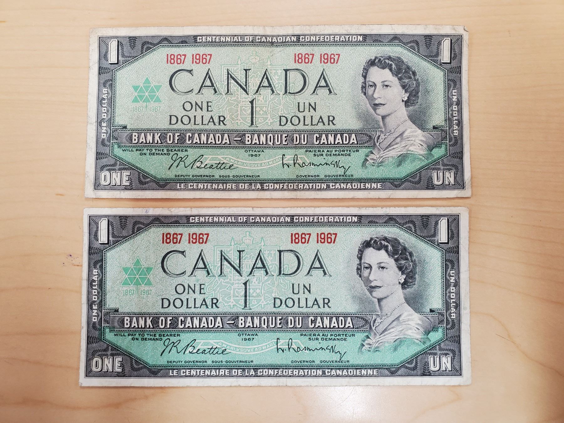 Two 1967 Canada one dollar bills - no serial #