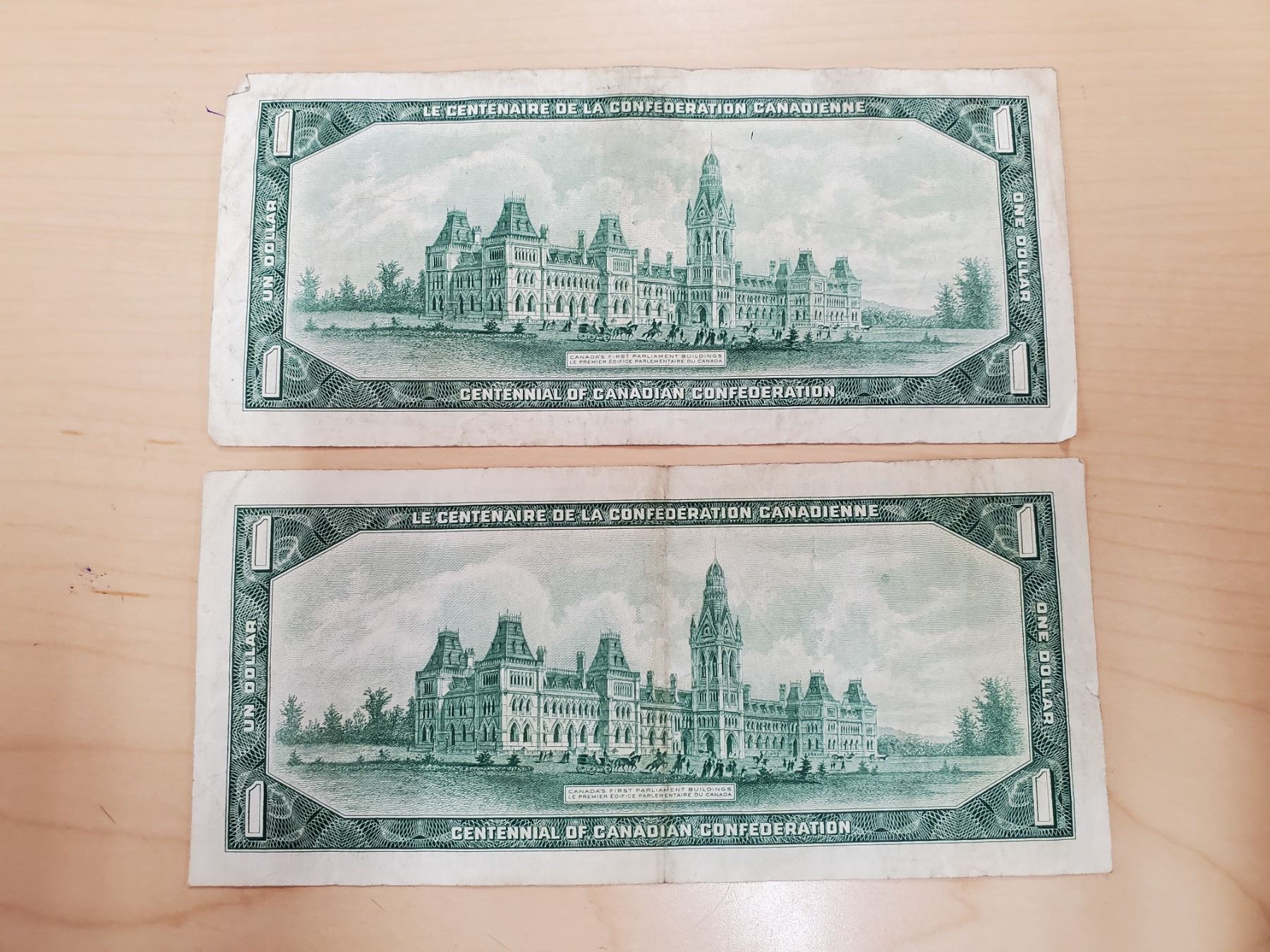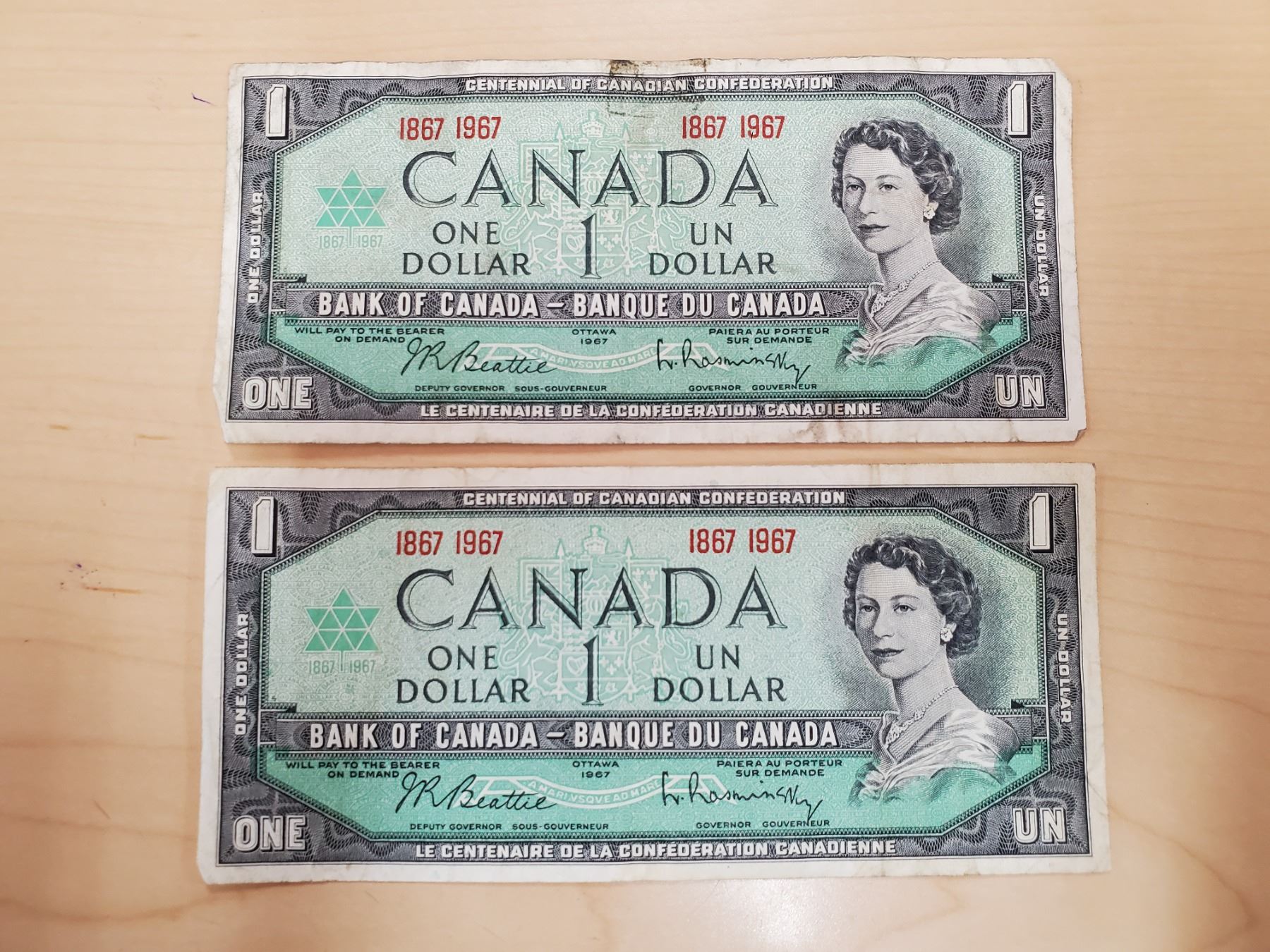 Two 1967 Canada one dollar bills - no serial #