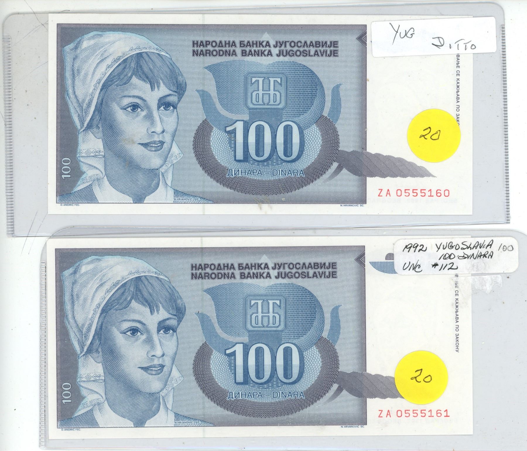 Two 1992 Yugoslavia UNC 100 Dinara bank notes