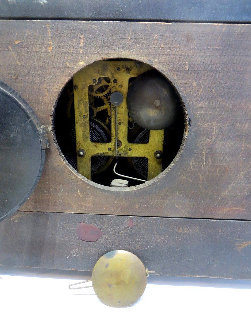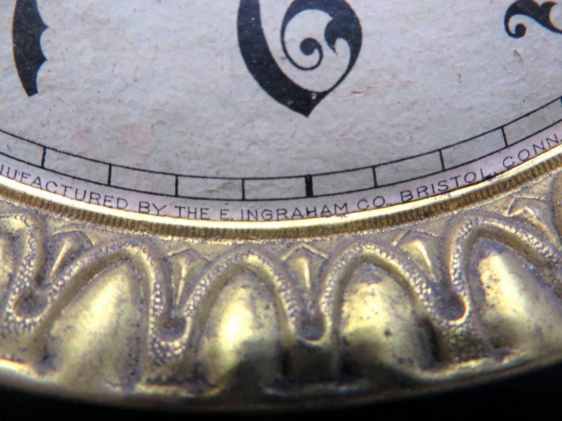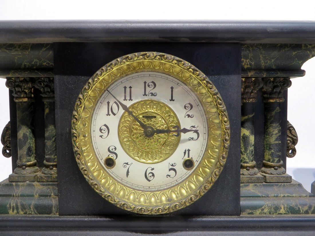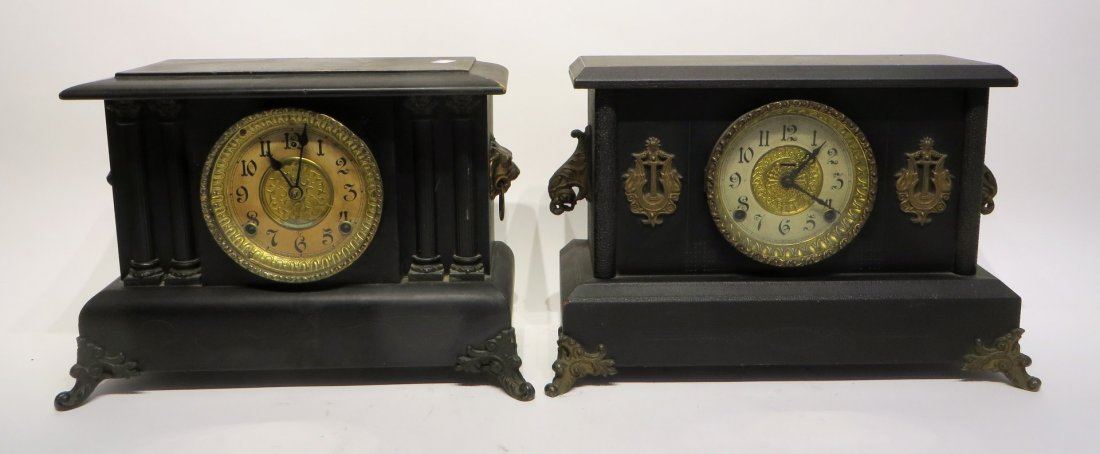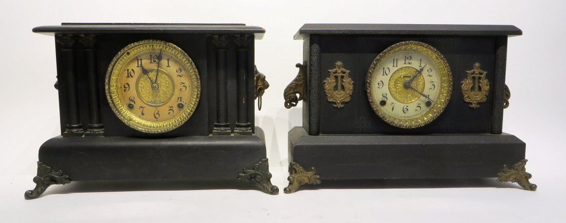 Two mantel clocks by Ingraham. One has marbleized columns and other painted decoration, it is missing the front left foot. The other brass handles, dial, feet, and front decoration.