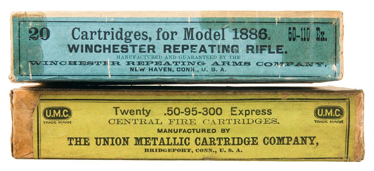 1) Twenty round, two piece box of Winchester Repeating Arms Company ammunition for the Winchester Model 1886 rifle in caliber 50-110-300 Winchester Express. The box has a blue label with cartridge illustration. The powder information label is attached to the body of the box. 2) Twenty round, Union Metallic Cartridge Company two piece box of ammunition for Winchester riffles in caliber 50-95-300 Express. Green illustration label with cartridge illustration. The back retains the green guarantee label with the number "1128" stamped in black ink on the lid and body of the box.