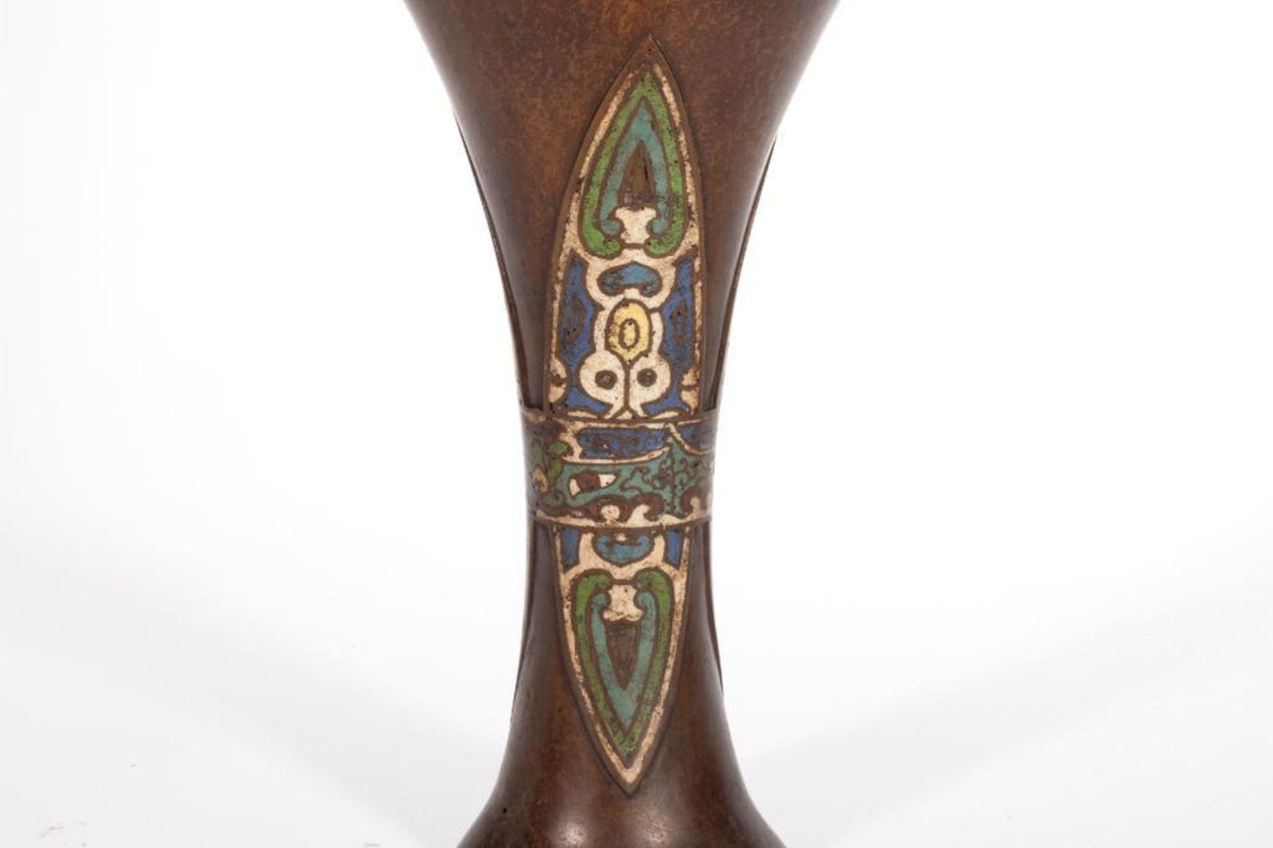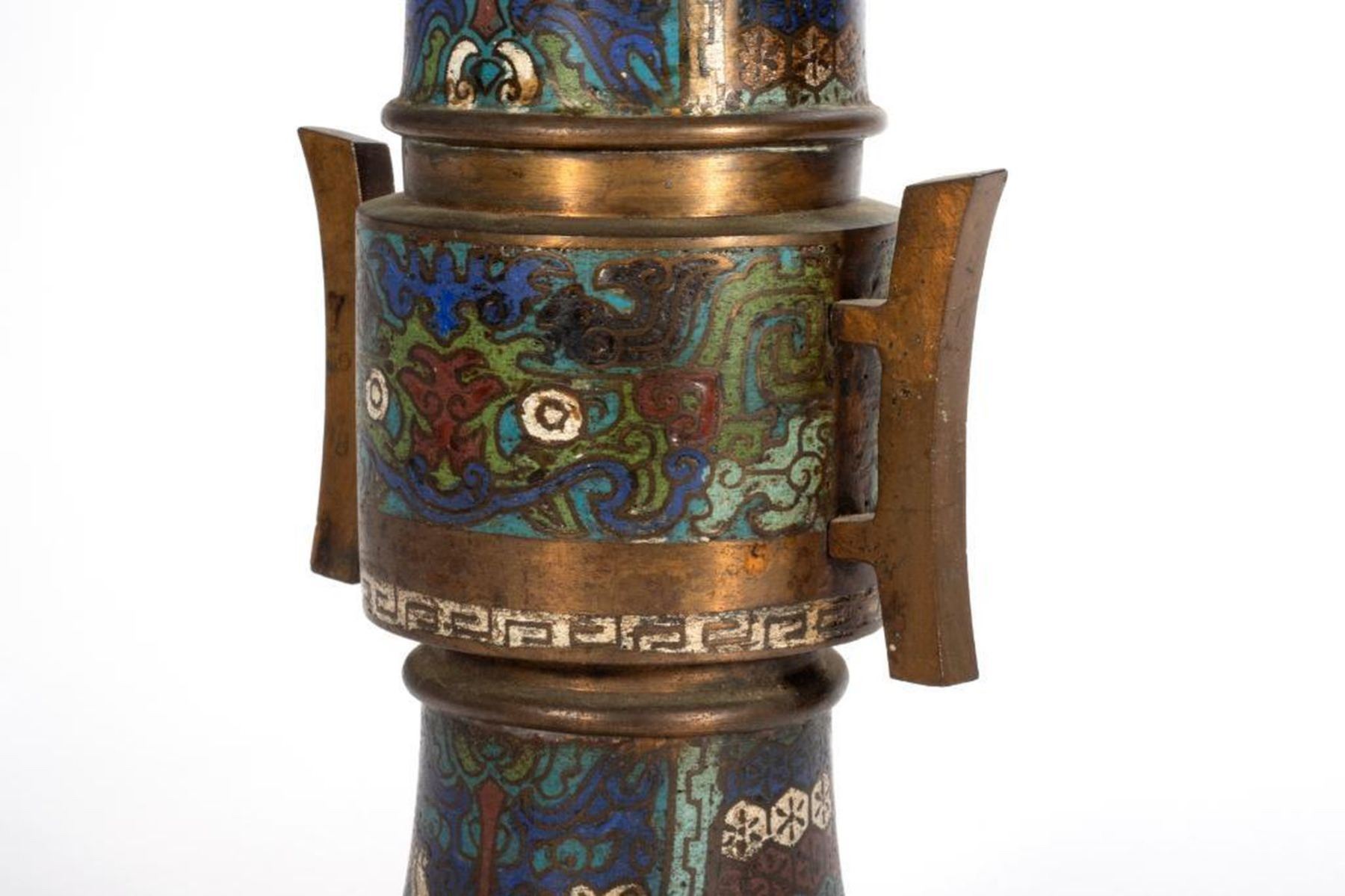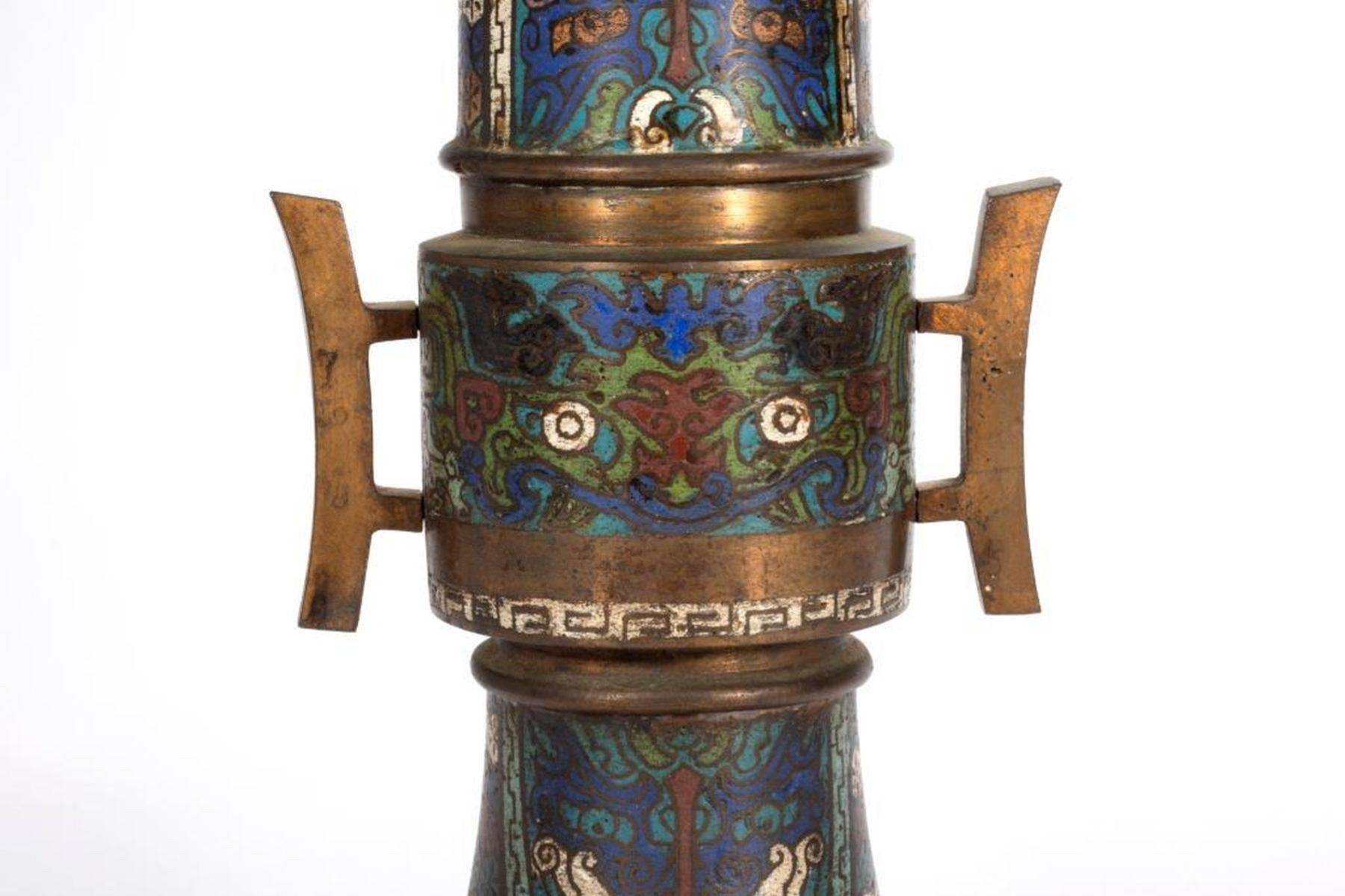 One decorated with stylized dragons, the second with cloisonne floral panels. greatest height 15 1/2in. Condition: minor pitting, ding to top edge of shorter vessel.