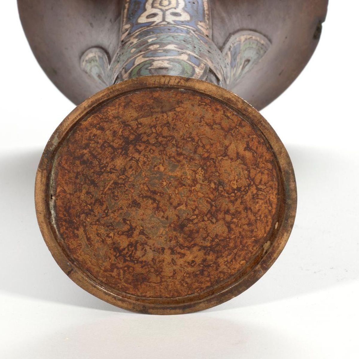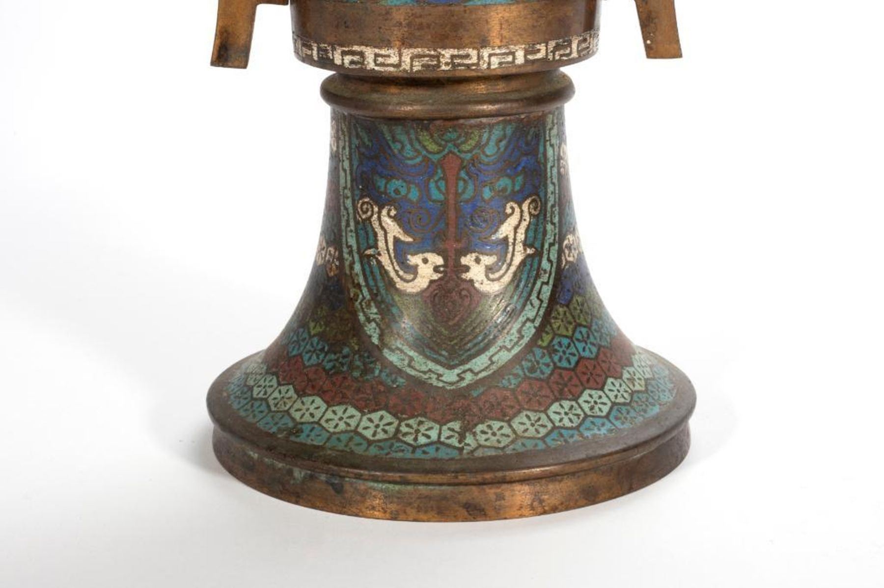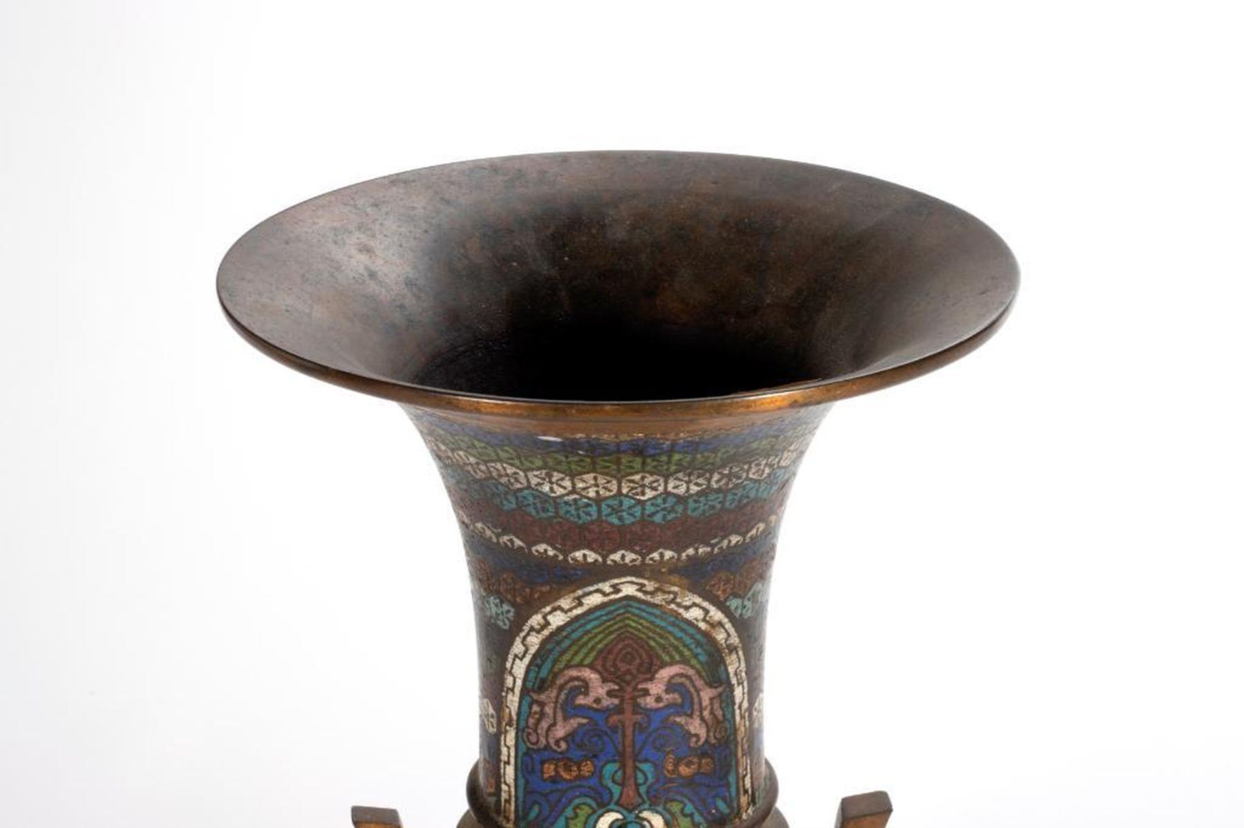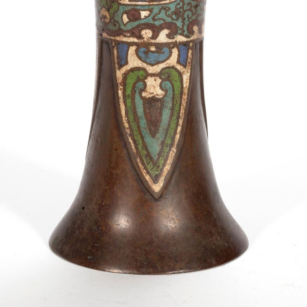One decorated with stylized dragons, the second with cloisonne floral panels. greatest height 15 1/2in. Condition: minor pitting, ding to top edge of shorter vessel.