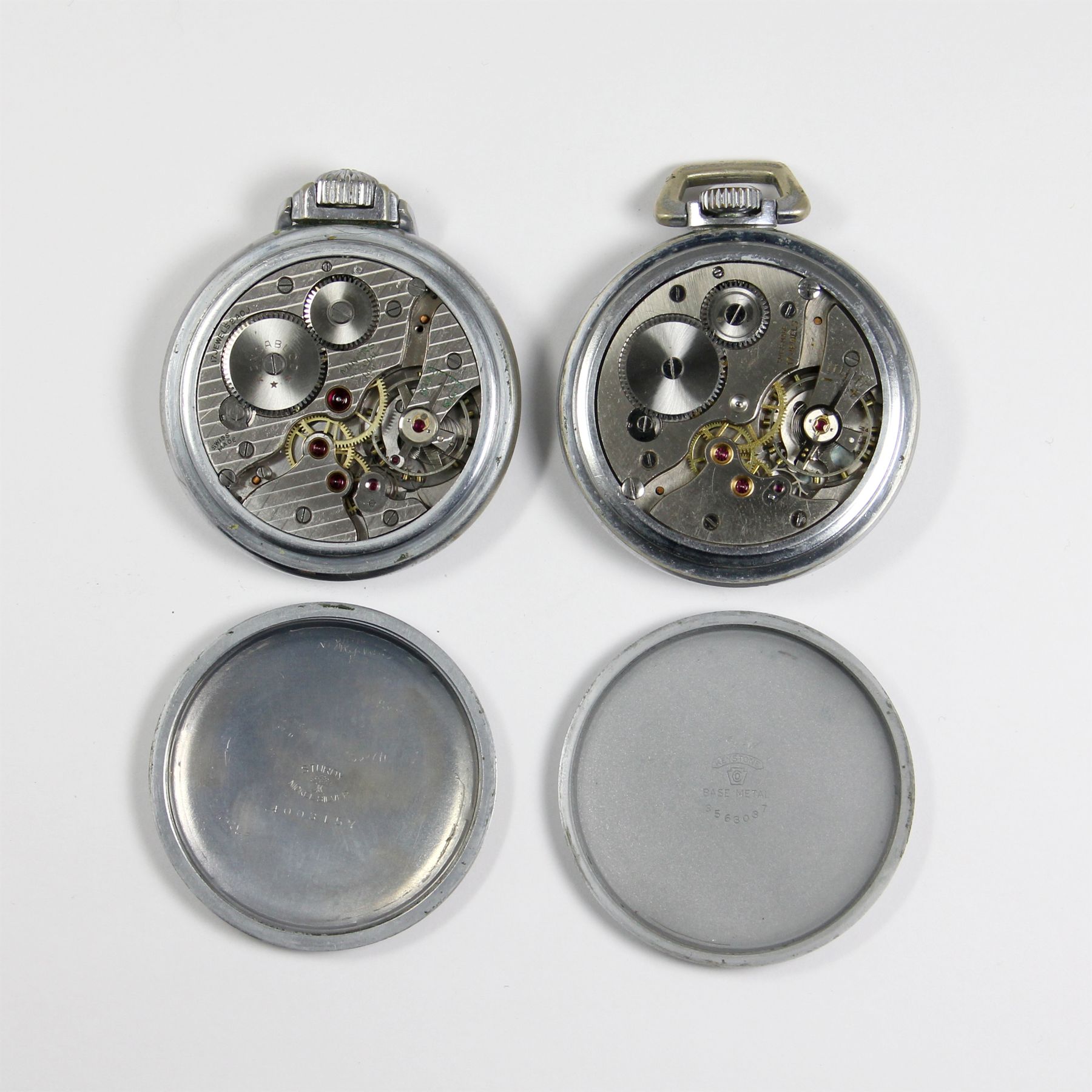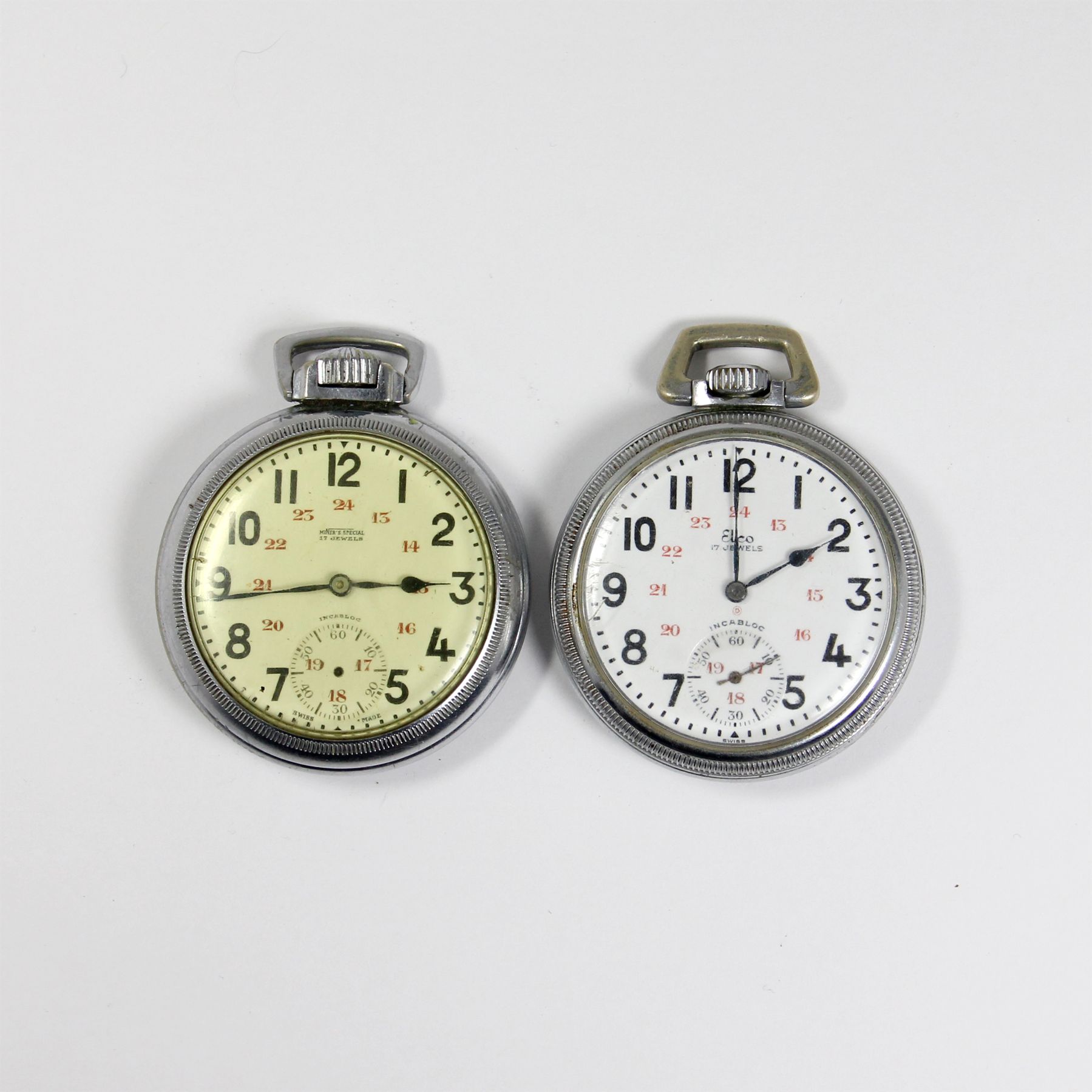 Two (2). Canadian. 1940s. "Elco" and "Miner's Special". Cases: Nickel silver. 16 size (43mm movement diameters). Each pendant set. The Elco watch was made (assembly of dial, case and movement) by Levy Brothers Co. Ltd. Hamilton, Ontario for the Canadian railroad. The Levy Brothers were Jewish immigrants from Alsace Lorraine who settled in the 19th century in Canada. They had a jewelery business. This watch is in functionality, appearance, size, weight and accuracy very similar to the 992B but it is more reliable in harsh working environments due to its Incabloc shock protection. The "Miner's Special" example would have a similar story, although we could not find information on its history. The Elco watch runs and stops. The Miner's Special watch does not run and has an uncoiled hairspring. Running watches have not been tested for timekeeping accuracy and may require adjustment. The fact that a watch has been described as "running" provides no guarantee of its ability to continue to do so.