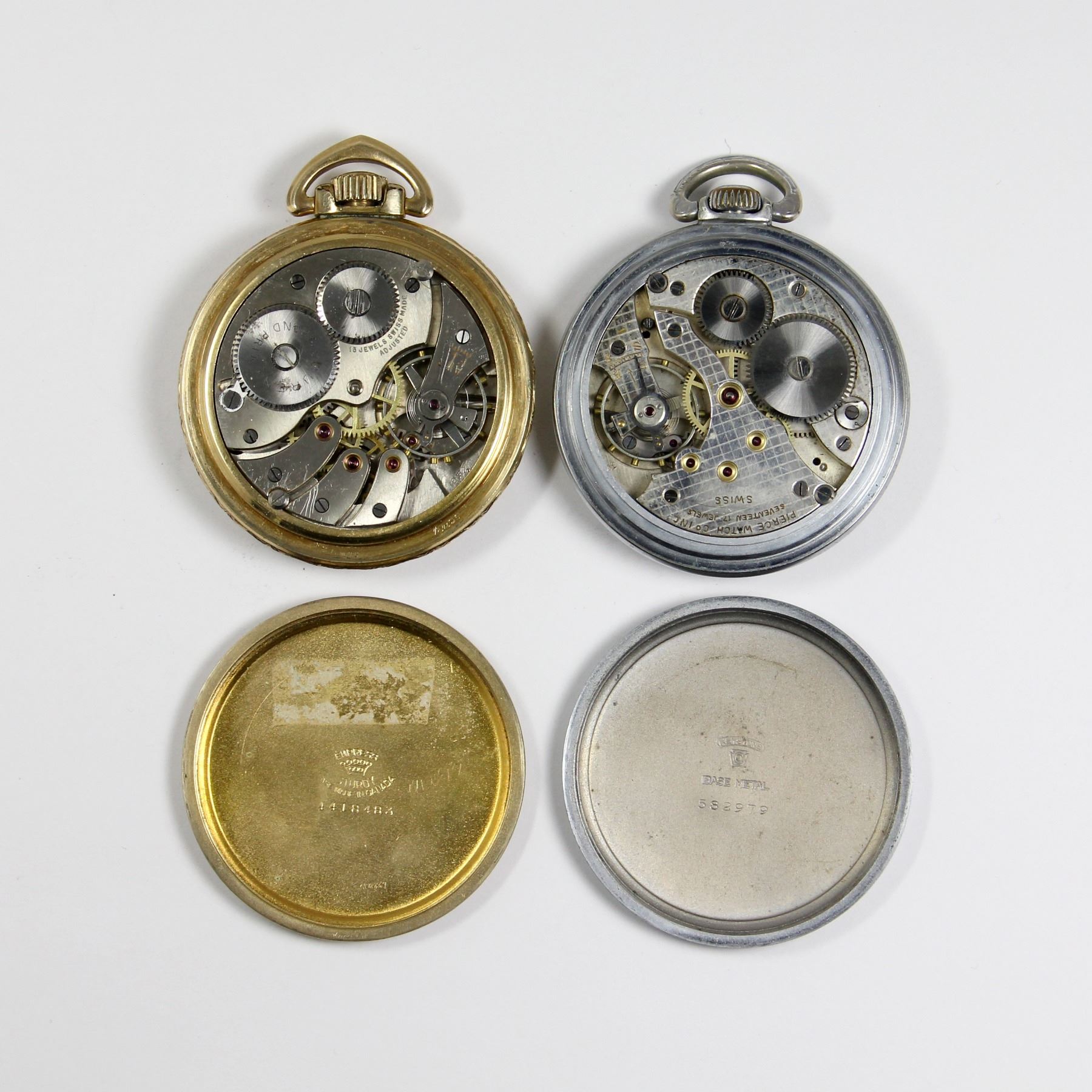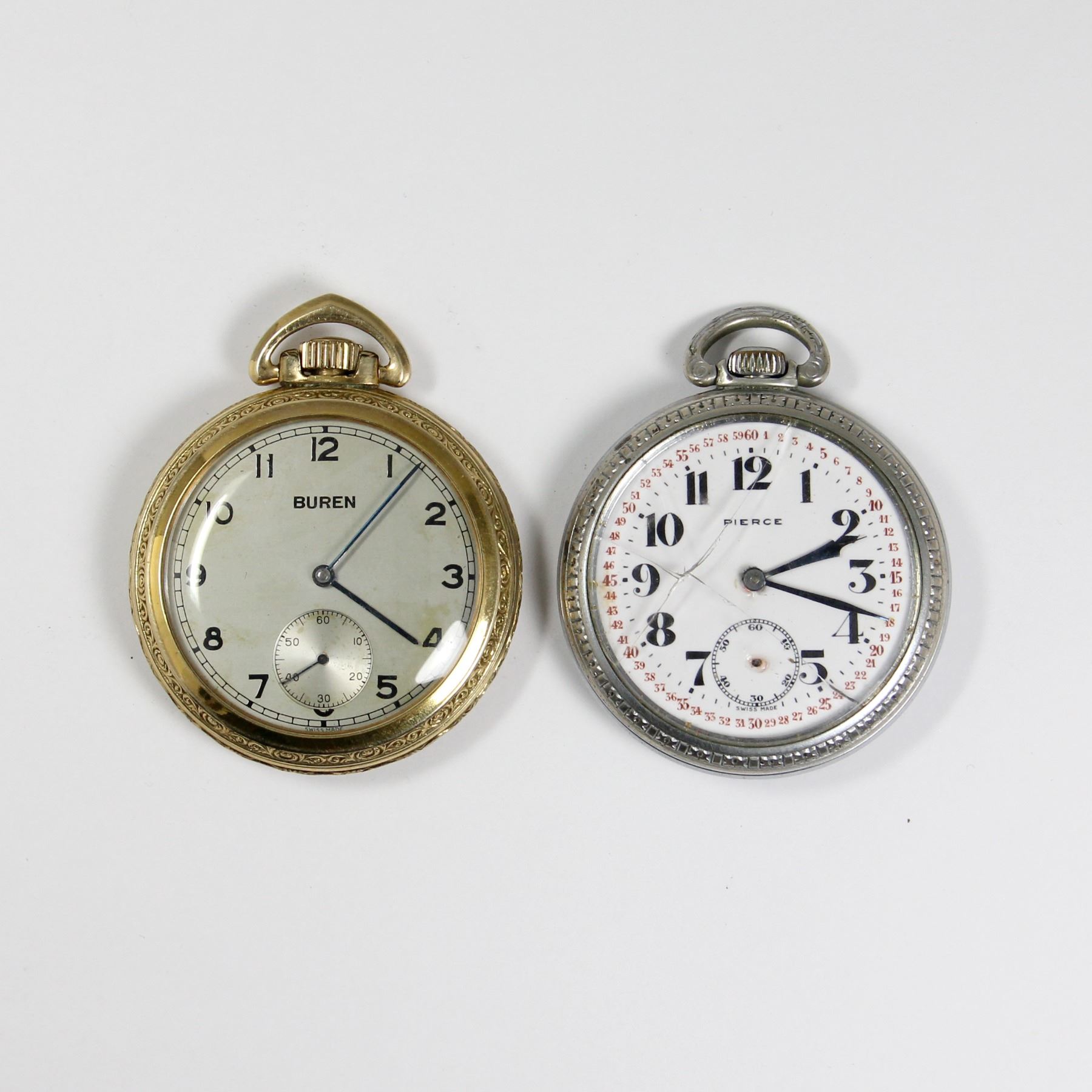 Swiss movements. 1940s. "Pierce Watch Co. Inc." and "Buren". Cases: Gold filled and nickel silver. Marked, "Keystone Base metal" and "Empress Sturdy Made in Canada". 16 size (43mm movement diameters). 17 jewels and 15 jewels. Th Buren watch is marked, "Grand Prix" on one of the winding wheels. The Pierce watch is running, but has a cracked crystal and missing seconds hand. The Buren watch is not running. Running watches have not been tested for timekeeping accuracy and may require adjustment. The fact that a watch has been described as "running" provides no guarantee of its ability to continue to do so.