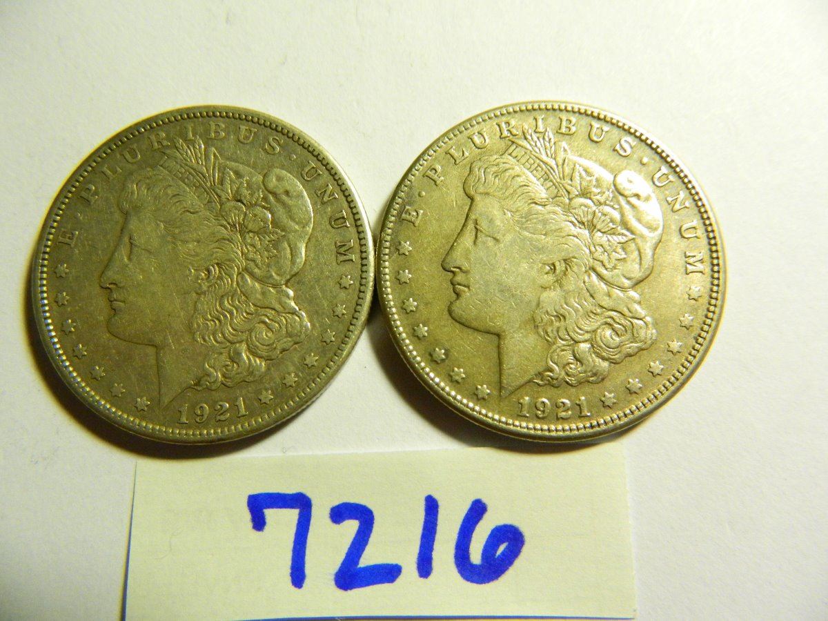Two (2) 1921-S Silver Morgan Dollars, Both One Money, 90% Silver