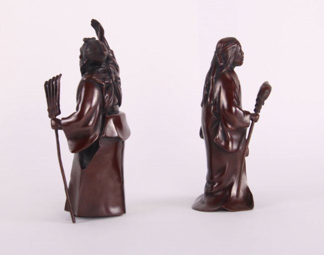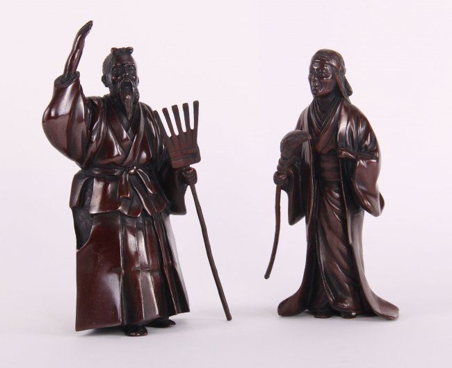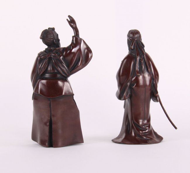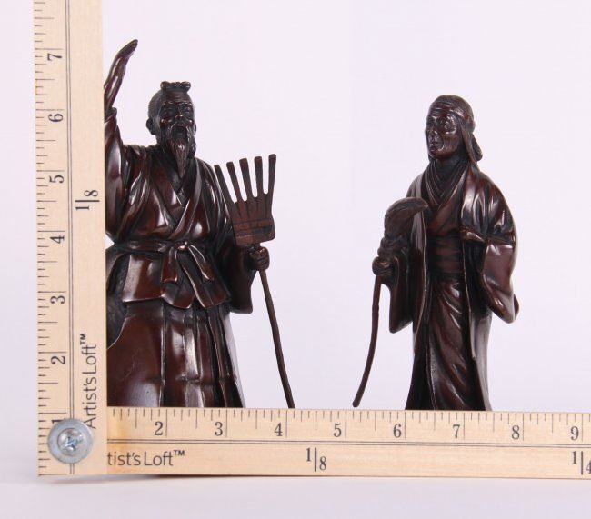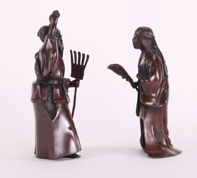 Two (2) 19th Century exquisite Japanese fine patined bronze sculptures. (Size: See second photo for measurement.) Photos are part of the description representing the condition report. Pangaea Auctions urges Bidder's to view all attached photos.