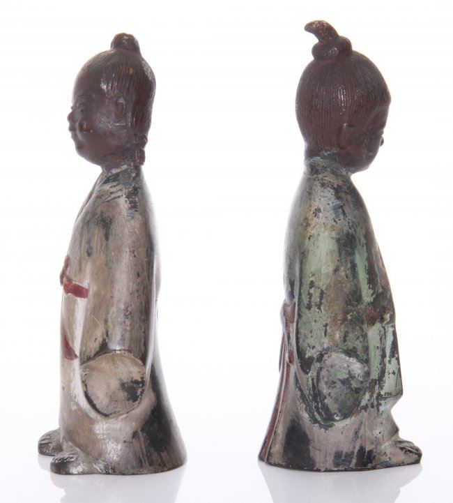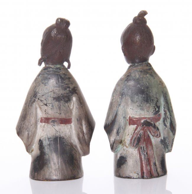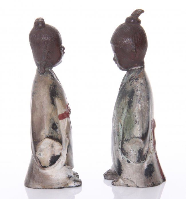 Two(2) Antique Japanese partially polychromed bronze figures of children wearing a kimono. SIZE: see attached ruler photo. Photos are part of the description representing the condition report and can be used for authentication prior to the sale date. Pangaea Auctions urges Bidder's to view all attached photos in detail.