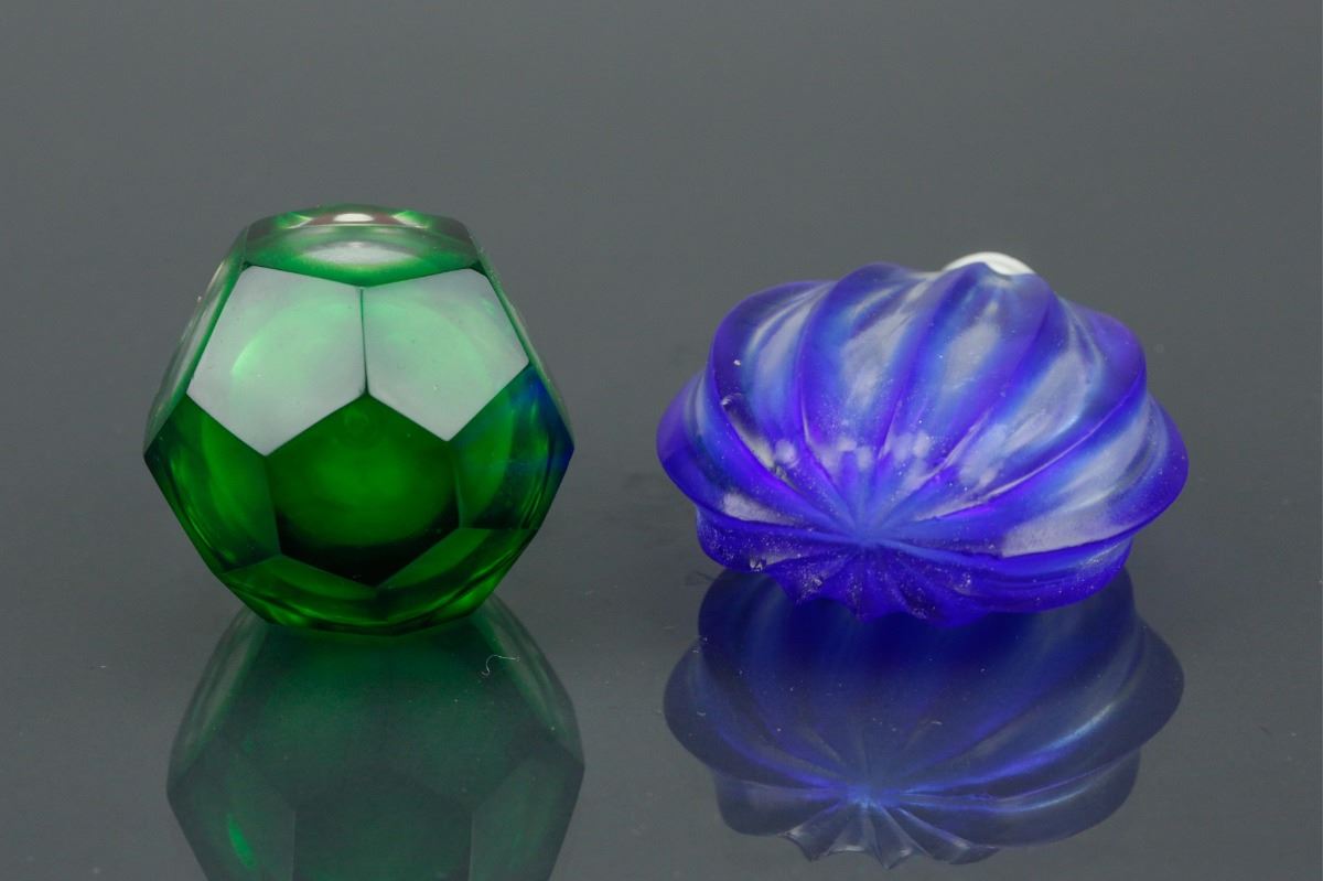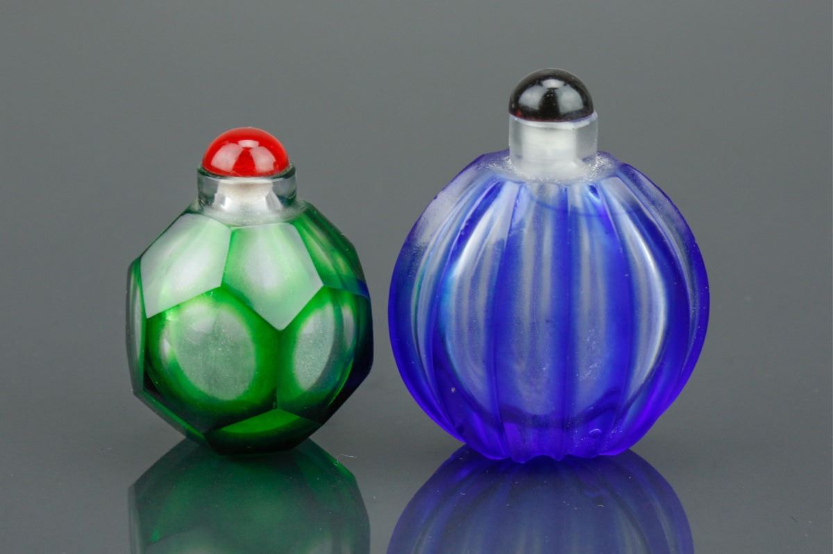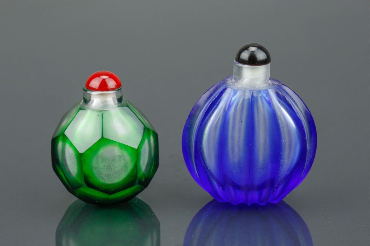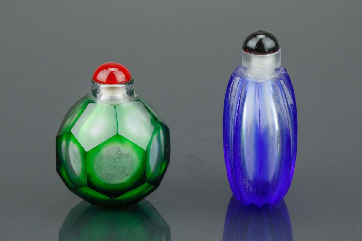 Two pieces of Chinese Peking glass snuff bottles; of polyhedron form; of emerald green and ocean blue tone; H: 7.5 cm, W: 4.5 cm, 142 grams total