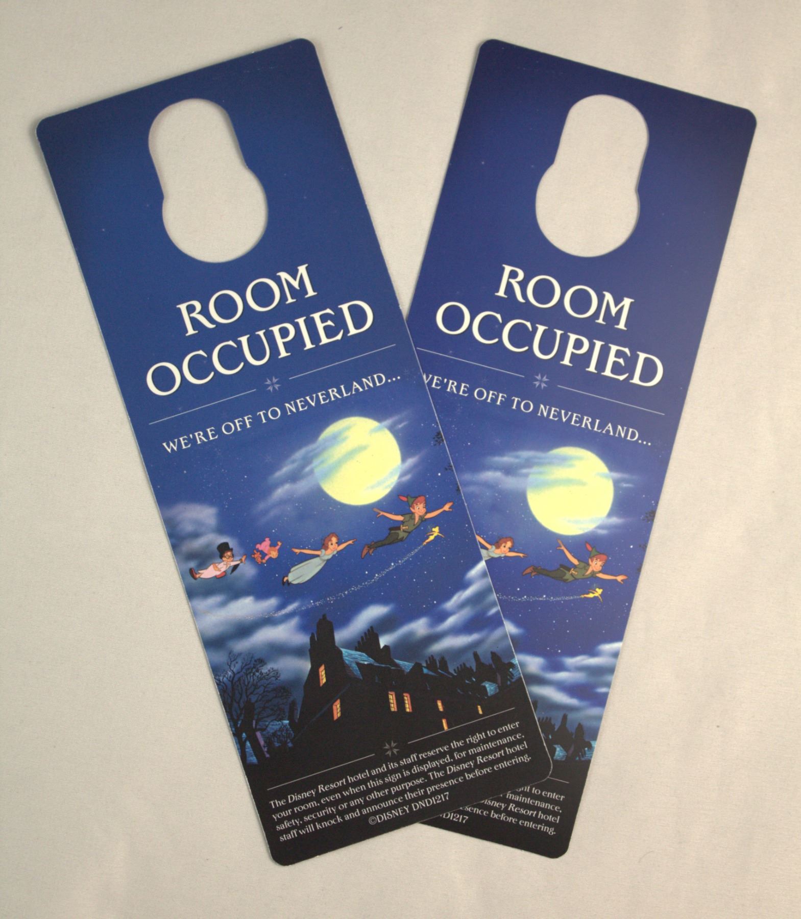 The Disney Resort room signs feature the characters of Peter Pan and state "Room Occupied" on both sides. The door hangers are made of plastic and are in near mint condition.