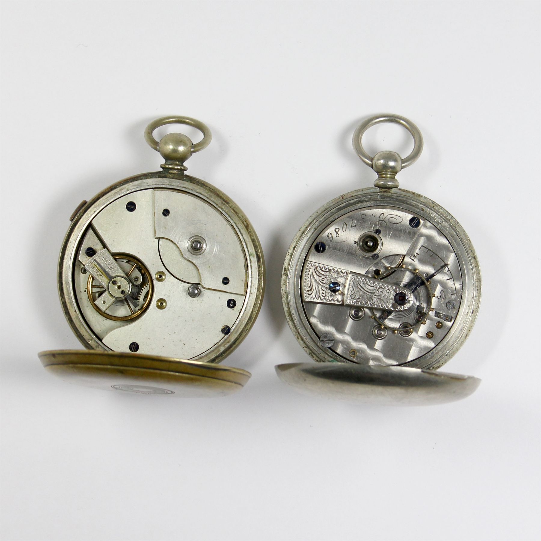 Two (2). Swiss. 1870s. Unbranded. Cases: Nickel silver. One marked, "Fahy's Silverore No. 1". 18 size (45mm movement diameter) and 20 size (46.5mm movement diameter). The larger example features a center seconds and millisecond register in outer chapter. The presence of a stop function suggests it may have been used by a Physician or similar application. The center seconds watch is wound tight and ticking sluggishly, then stops. The other example has a broken click spring, but runs when the spring is held under power. It also is missing its seconds hand and has a large chip from the dial at 3 o'clock. Running watches have not been tested for timekeeping accuracy and may require adjustment. The fact that a watch has been described as "running" provides no guarantee of its ability to continue to do so.