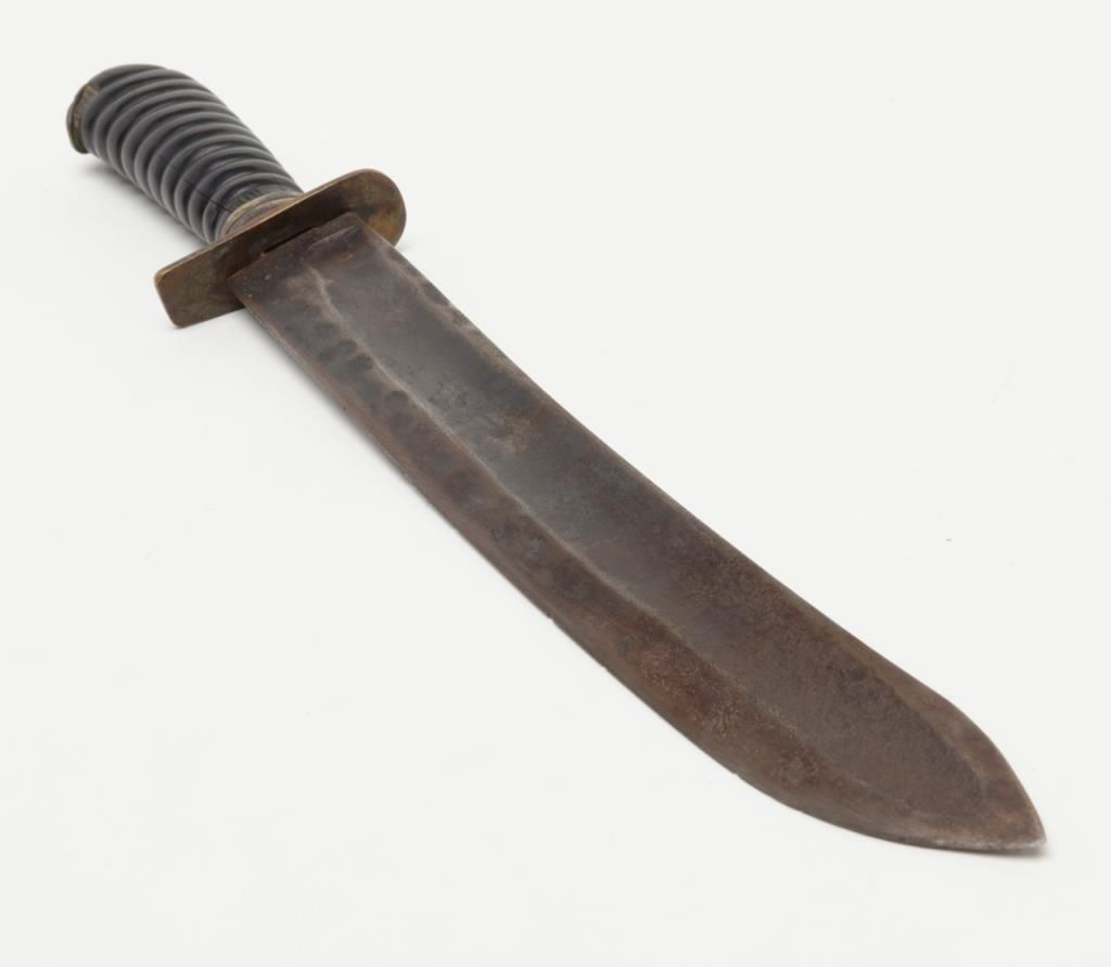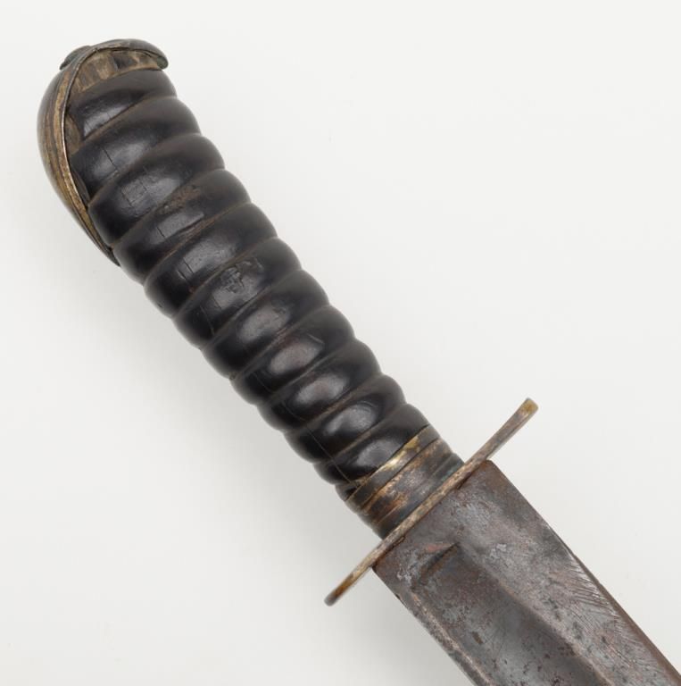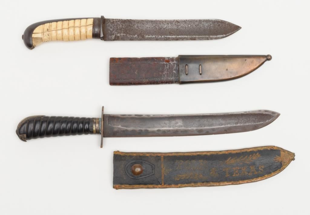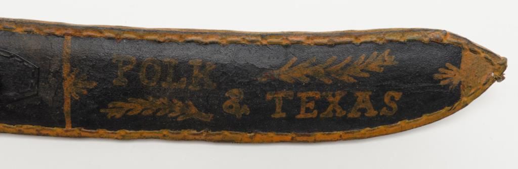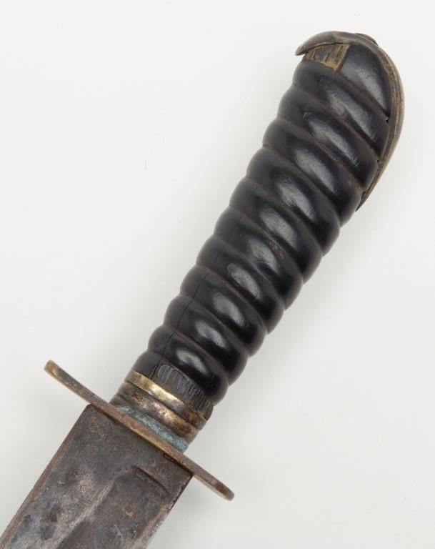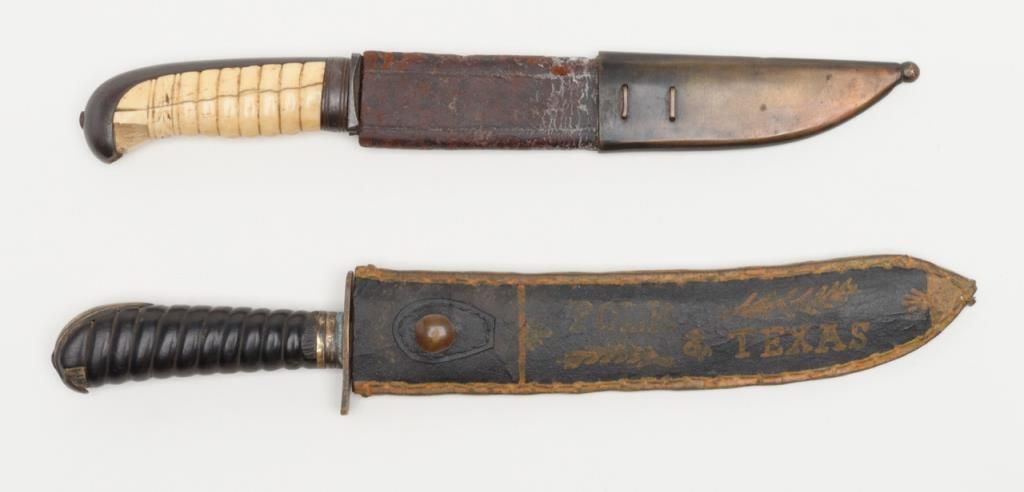 Two (2) Historic Bowie knives carried in Mexican-American war, One by Sgt. Louis H. Wunder, and the other captured by him from a Mexican combatant. (1) Sgt. Wunder’s knife is approximately 14 ¾” with 10” blade, made from anAmerican officer’s type sword, with simple grooved wood grip, brass guard and ferrule, with sword type pommel in handmade leather scabbard that is of the period with brass button type fastener in military fashion, blackened leather with painteddecoration; center portion is painted “Polk & Texas” with leaf borders. The knife is in good condition with slight to moderate pitting; scabbard is good to very good with some cracking, small losses and flaking to the leather, butgenerally good overall; there are some small chip around the pommel and slight cracks, some even wear and general use, but good to very good overall with a rich un-cleaned and untouched patina. (2) Bowie knife made from a cut down sword with grooved bone grip, blade shows “Republica” marking on the left side barely visible with foreign maker’s proof (probably Solingen), 12 ¼” with 8” blade reconfigured to a spear point shape, guard is reduced from D-type sword guard; with