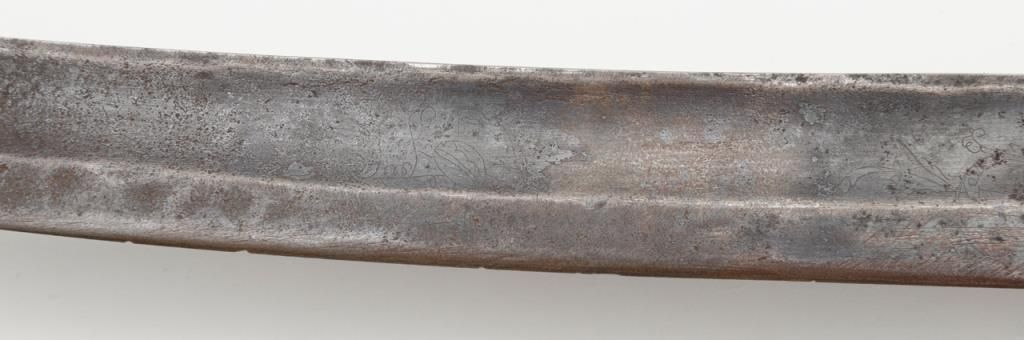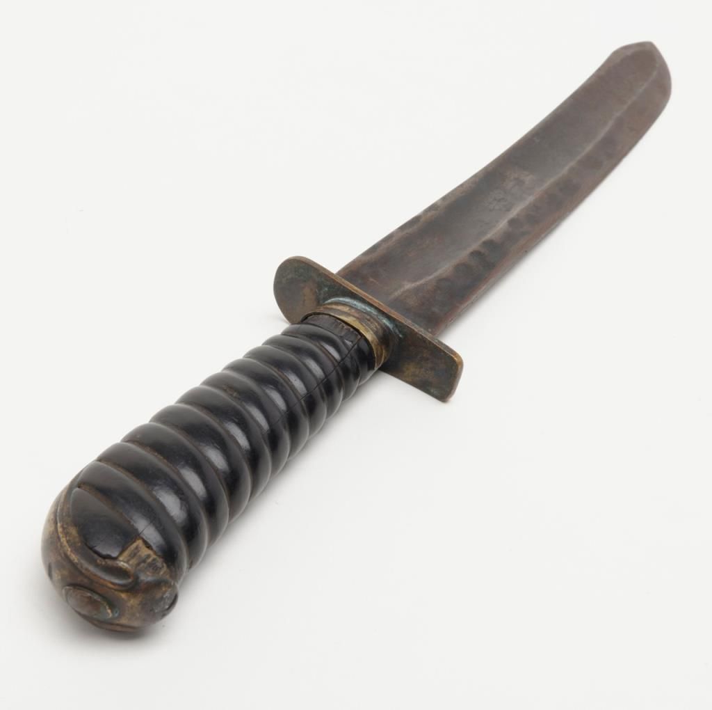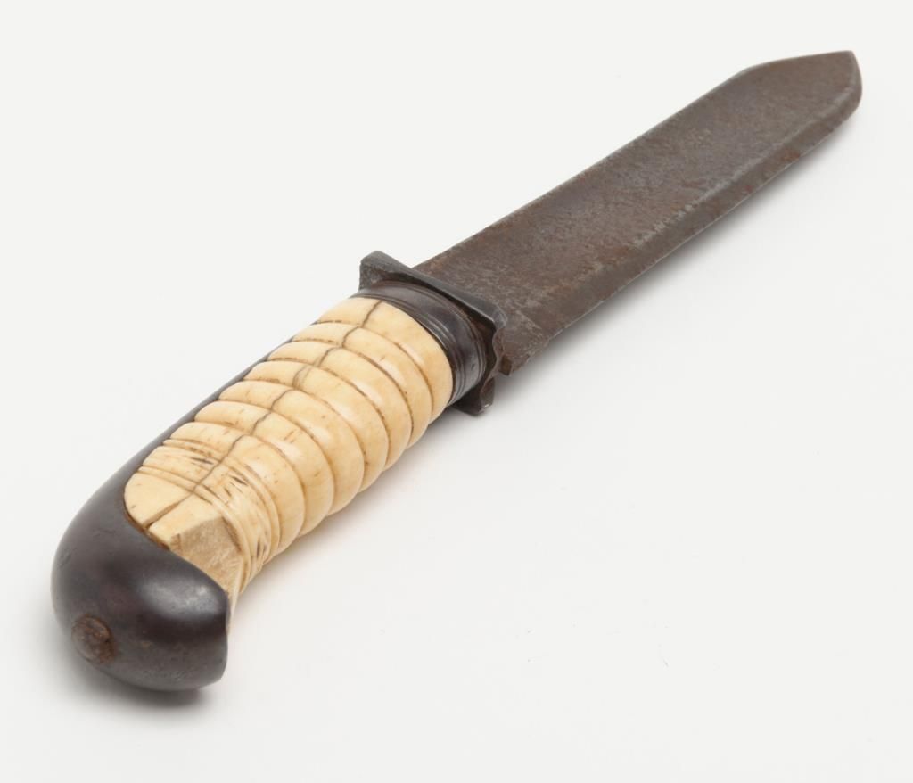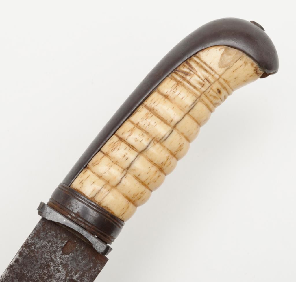 Two (2) Historic Bowie knives carried in Mexican-American war, One by Sgt. Louis H. Wunder, and the other captured by him from a Mexican combatant. (1) Sgt. Wunder’s knife is approximately 14 ¾” with 10” blade, made from anAmerican officer’s type sword, with simple grooved wood grip, brass guard and ferrule, with sword type pommel in handmade leather scabbard that is of the period with brass button type fastener in military fashion, blackened leather with painteddecoration; center portion is painted “Polk & Texas” with leaf borders. The knife is in good condition with slight to moderate pitting; scabbard is good to very good with some cracking, small losses and flaking to the leather, butgenerally good overall; there are some small chip around the pommel and slight cracks, some even wear and general use, but good to very good overall with a rich un-cleaned and untouched patina. (2) Bowie knife made from a cut down sword with grooved bone grip, blade shows “Republica” marking on the left side barely visible with foreign maker’s proof (probably Solingen), 12 ¼” with 8” blade reconfigured to a spear point shape, guard is reduced from D-type sword guard; with