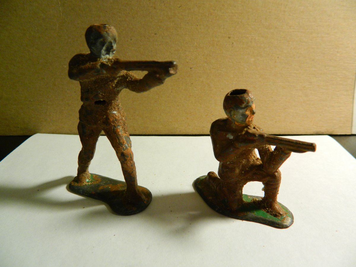 (no helmets), If I remember these were made by Barclay and had Orange Socks originally. not much of face on standing soldier. ouch. both one money