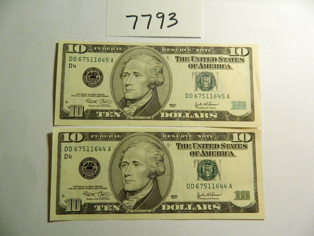 Two (2) Sequentially Numbered 2003 $10 Bills, UNC, All One Money, Nice estate Find!