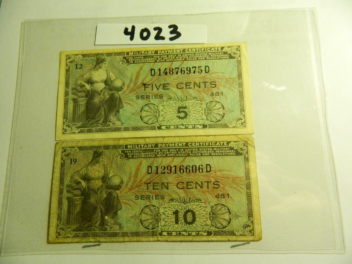 Two (2) Series 481 U.S. Military Payment Certificates, Both One Money, Five Cents and Ten Cents