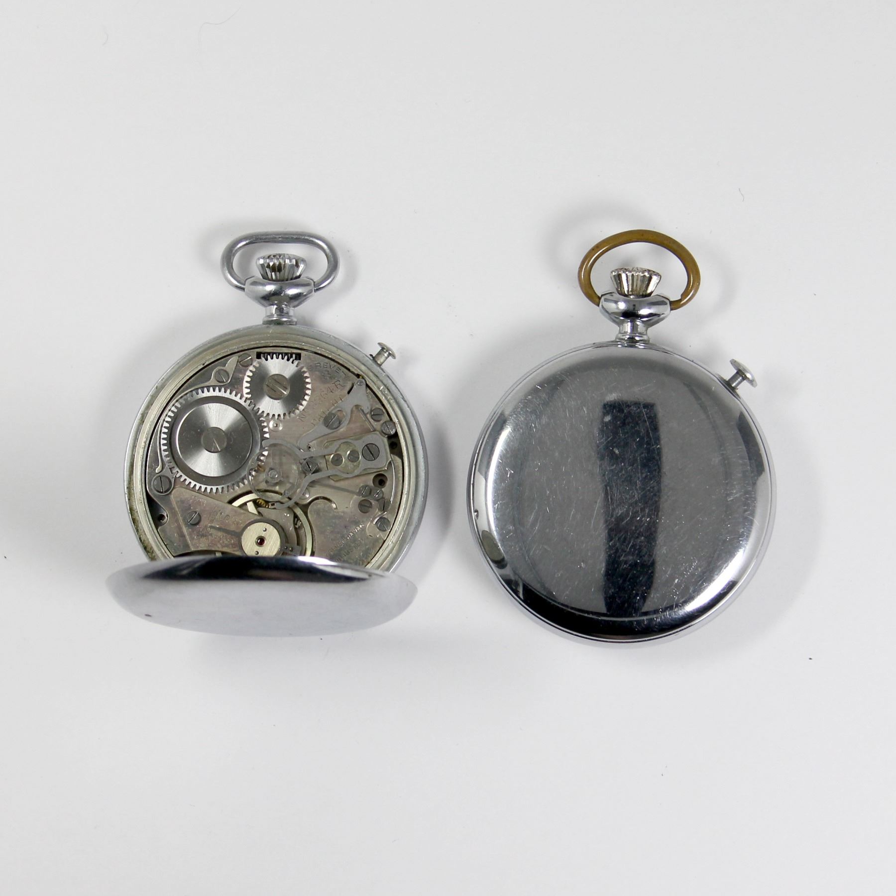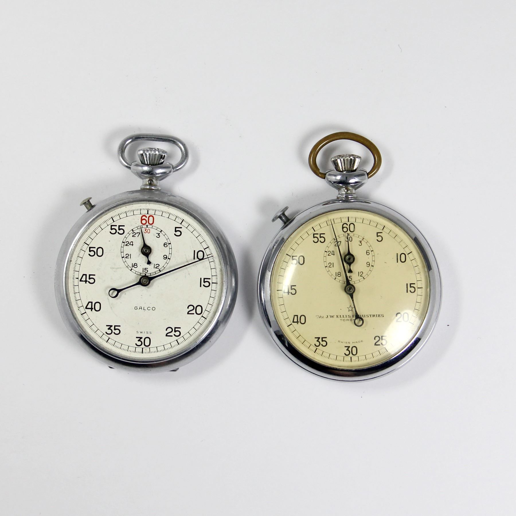 Two (2) Swiss. 1940s. Branded, "Galco" and "The J.W. Ellis Industries, Toronto". Cases: Polished nickel silver. 16 size (43mm movement diameters). Each not running. The Ellis watch has a broken mainspring. Galco is missing its crystal. Running watches have not been tested for timekeeping accuracy and may require adjustment. The fact that a watch has been described as "running" provides no guarantee of its ability to continue to do so.