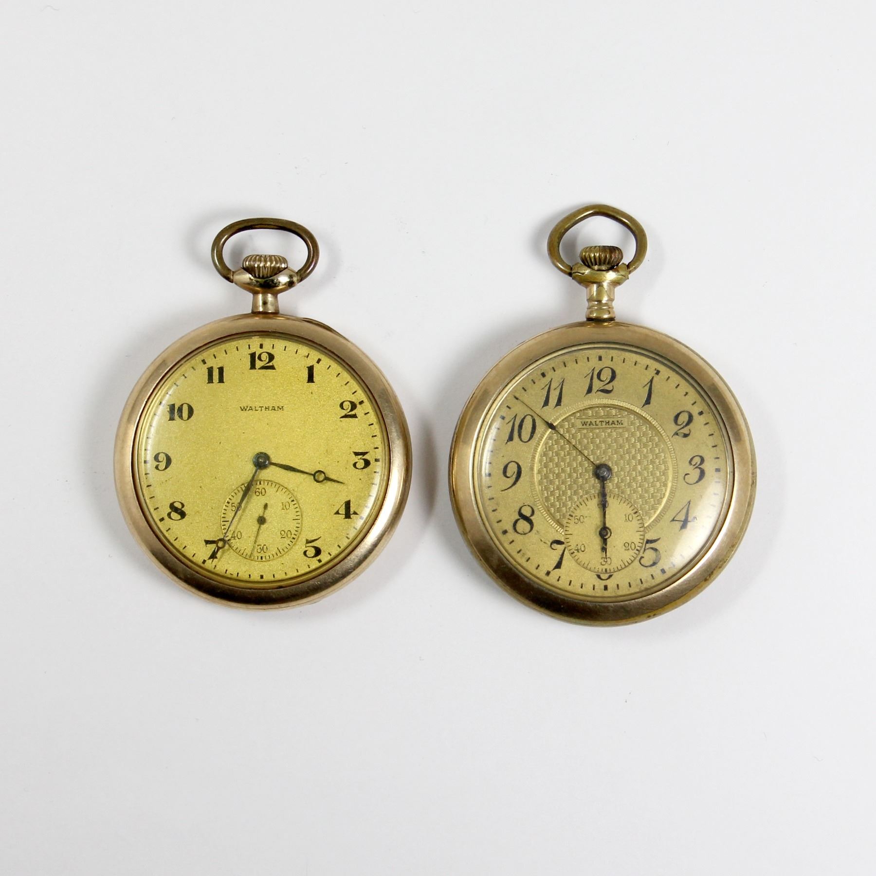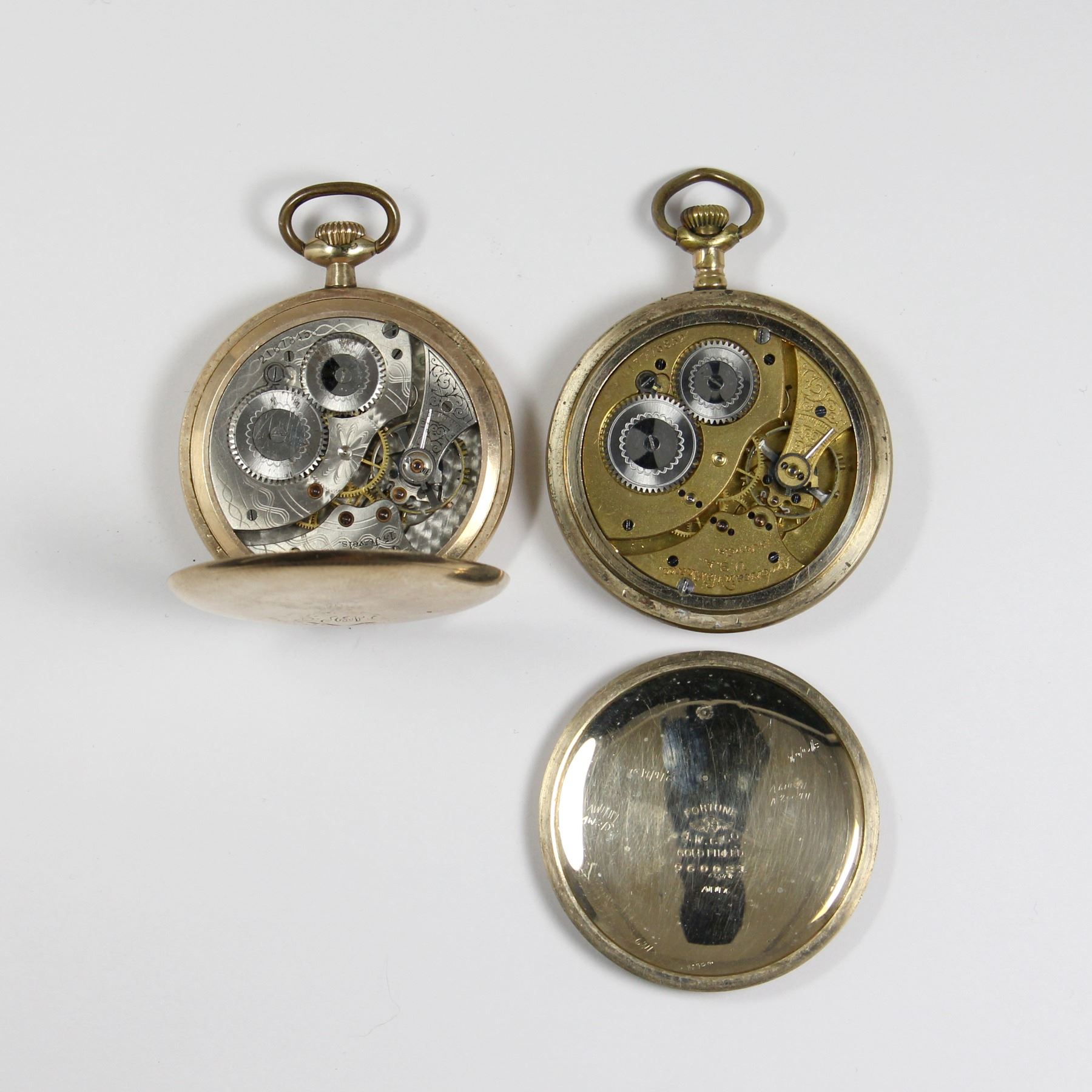 Two (2). American. American Waltham Watch Company. Cases: Gold filled. Marked, "Fortune (winged wheel) A.W.C. Co. Gold Filled" and "Peerless (winged wheel) A.W.C. Co.Gold Filled". Each 14 size (41.5mm movement diameters). Each complete and running. Brassing to the outer margin of one caseback. Running watches have not been tested for timekeeping accuracy and may require adjustment. The fact that a watch has been described as "running" provides no guarantee of its ability to continue to do so.