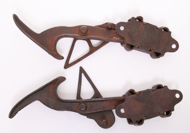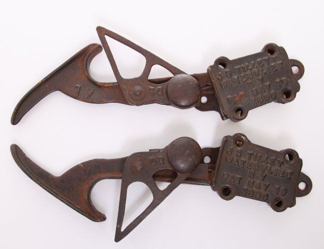 Two(2) antique Iron extension ladder ratcheting brackets JS Tilley Watervliet NY 1896 SIZE: see attached ruler photo. Photos are part of the description representing the condition report and can be used for authentication prior to the sale date. Pangaea Auctions urges Bidder's to view all attached photos in detail.